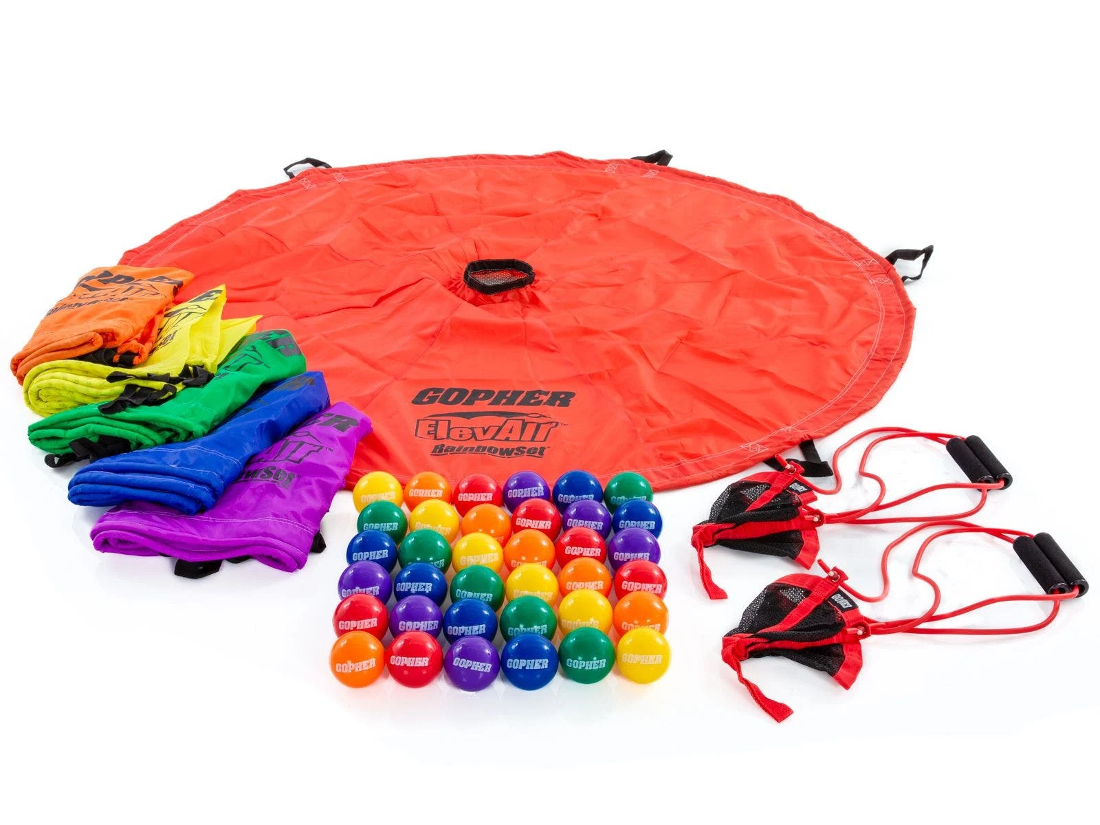 Lightweight, 11 oz launcher includes 5″L plastic handles with soft grips for comfort. The nylon and mesh cradle is attached to two 22″L latex bands. ElevAir Parachutes are made of durable rip-stop nylon and include 6 handles. Set includes 2 ball launchers, 6 parachutes (6′ dia), 36 vinyl balls (3″ dia), and activity instructions.