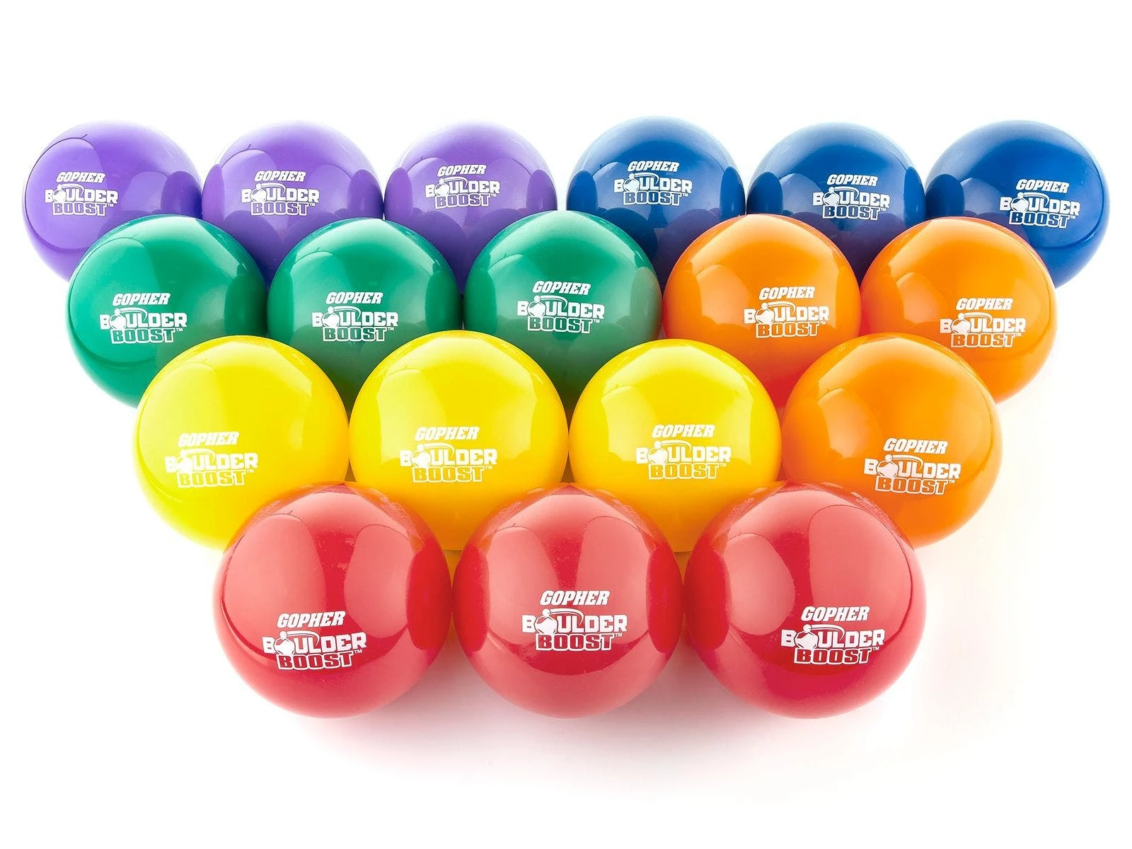 Set includes 1 boulder (23″L x 20″W x 19″H; 6-1/2 lb), 18 vinyl balls (7″ dia), 1 weighted bullseye ball (7″ dia), a VersaBag mesh storage bag, and activity instructions.