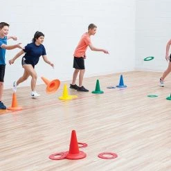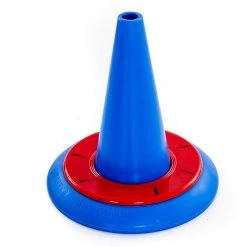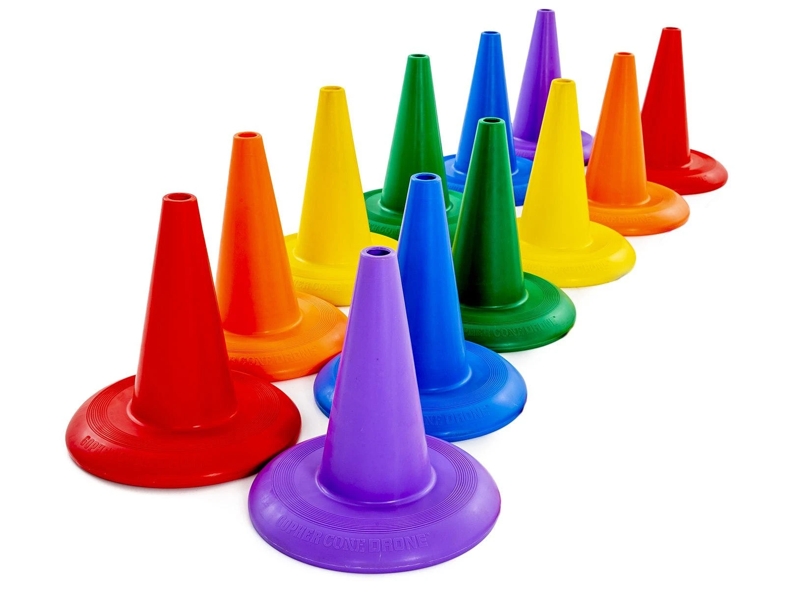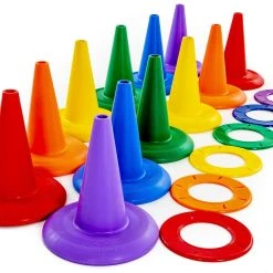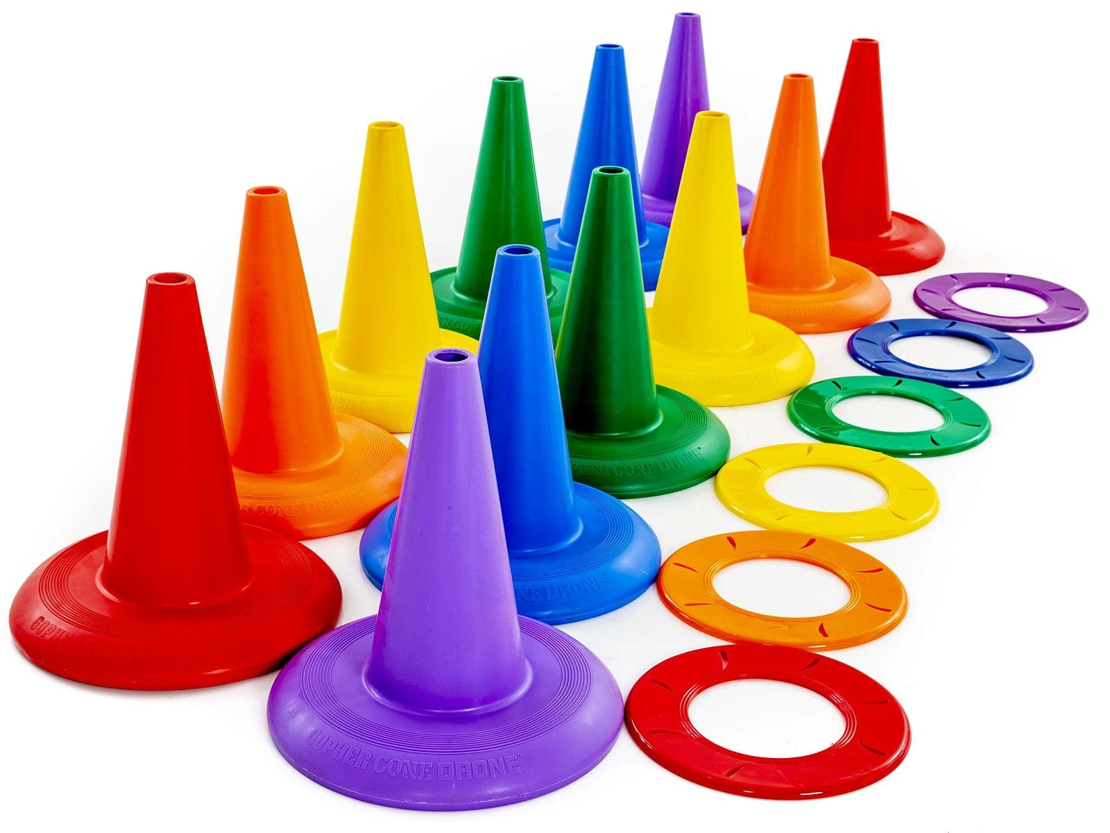 Cones are made of a combination of polypropylene and TPE plastics, keeping them soft and flexible for safer throws. They are 12″H x 11-1/4″ dia with the attached disc, so they can also be used as a standard cone during other activities. Vinyl discs are 9″ dia with a 5″ dia center hole.