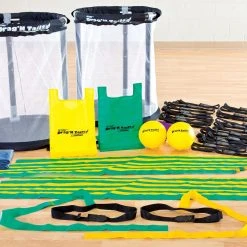 Complete Set includes 24 flag belts (12 ea yellow, green tails), 2 custom goals, 2 coated-foam balls, 2 pinnies (1 ea yellow, green), a mesh storage bag, and activity instructions. Additional belts also sold separately.