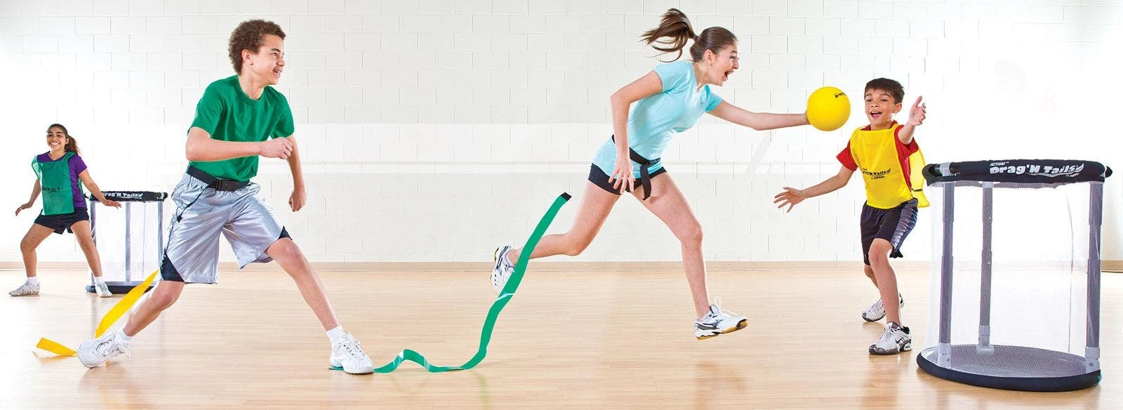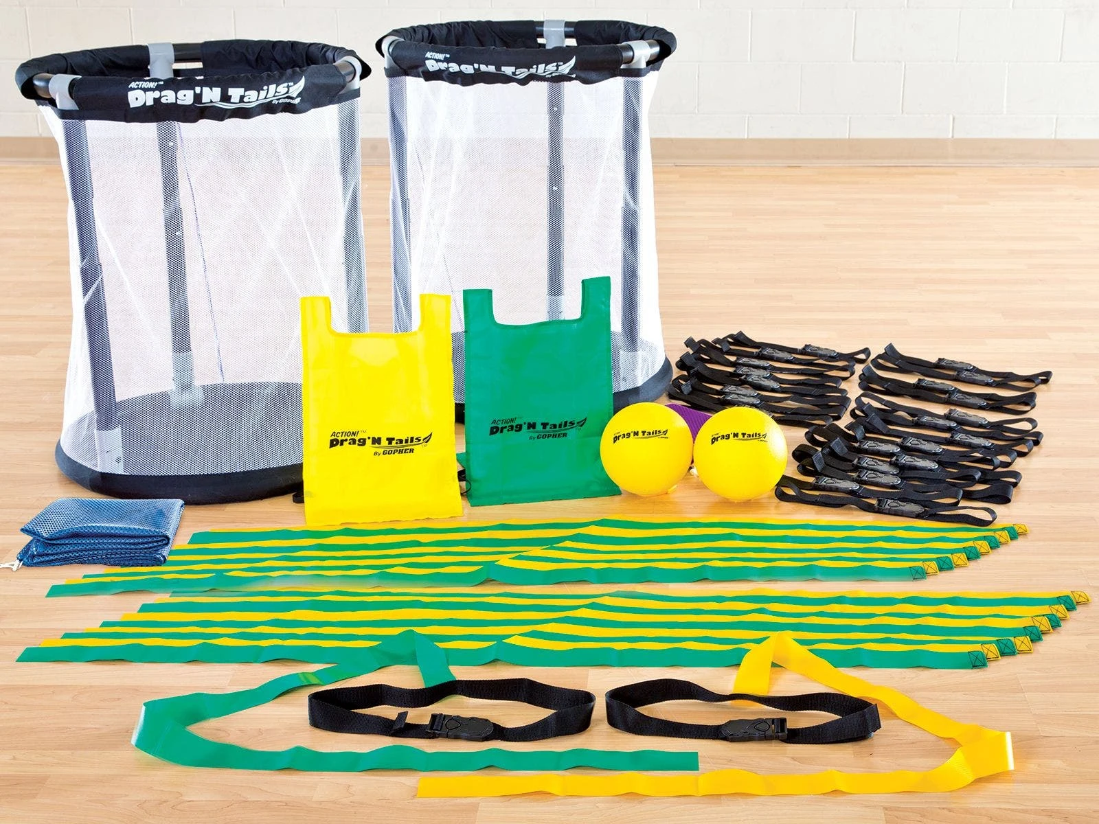 Drag’N Tails features 3 original flag belt activities that will get all your PE students up and moving for an entire class period. In one of the games, players try to step on other players tails while avoiding their tail being stepped on. When a player’s tail is stepped on, he/she must retrieve it, exit the playing area, perform an exercise, and then re-enter the game. Play continues for a predetermined amount of time.