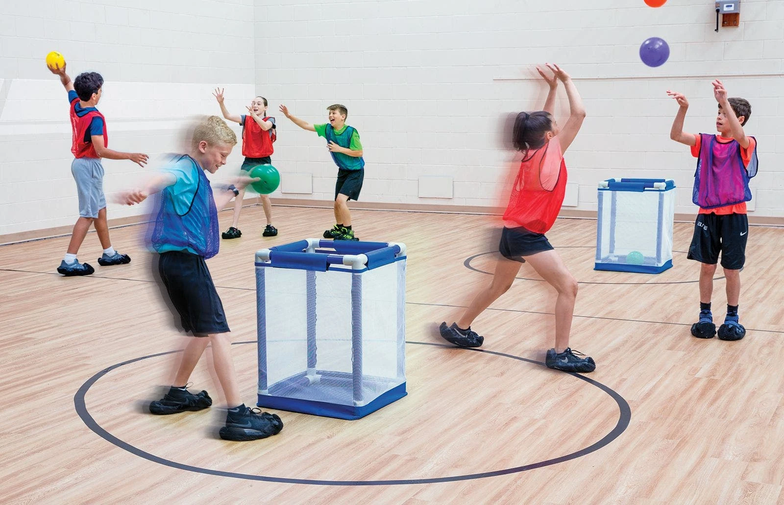 Add a slick challenge as players wear our fabric GoGliderz on their feet to “skate” or slide across the floor. Players in possession of 1 of their team’s 3 balls can take 3 steps and a slide before passing or attempting to score. Offense can score from outside the slide zone for 2 points or slide into the zone for 1 point, but watch for defensive players that will intercept balls!