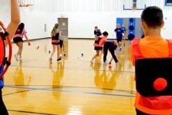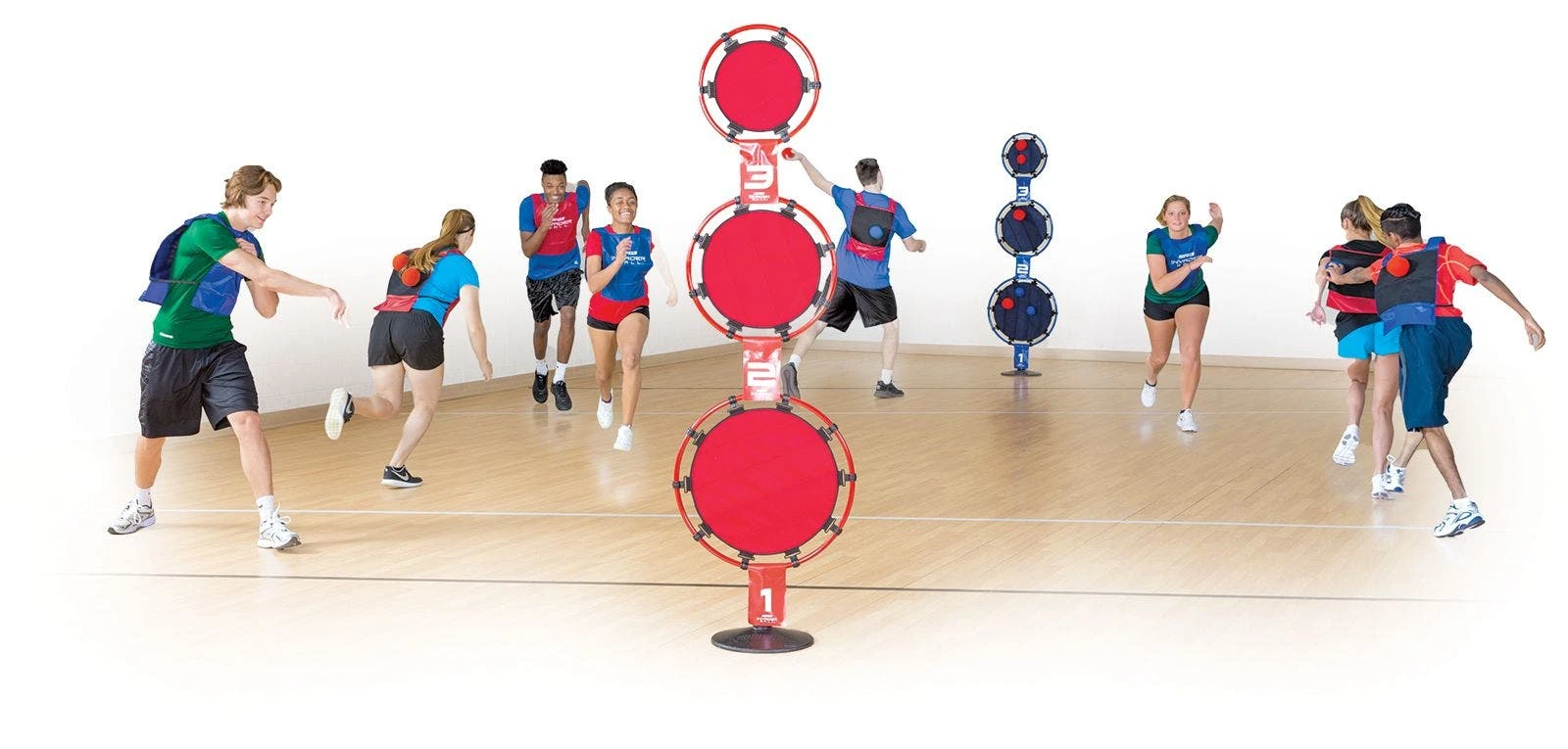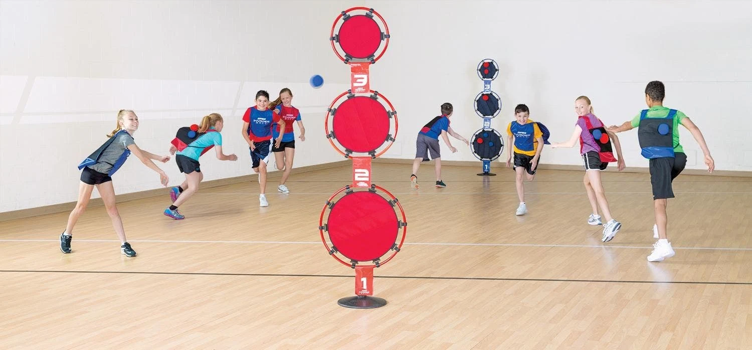 Varying the distance players must throw to hit the goal make the game great for all ages. You can also place the targets side by side in the middle of the gym.