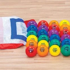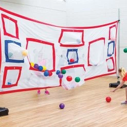 Teams throw vinyl balls at the divider’s mesh pockets, attempting to obtain possession and earn points. Knock out the other team’s balls from a pocket and possession flips! Eleven pockets vary in size, point values, and are shallow to increase the challenge. The team with the most points at the end of the game wins! Set includes 1 nylon divider (7’H x 20’W) that attaches to your existing standards, 36 Rainbow balls (7″ dia), a VersaBag mesh storage bag, and activity instructions.