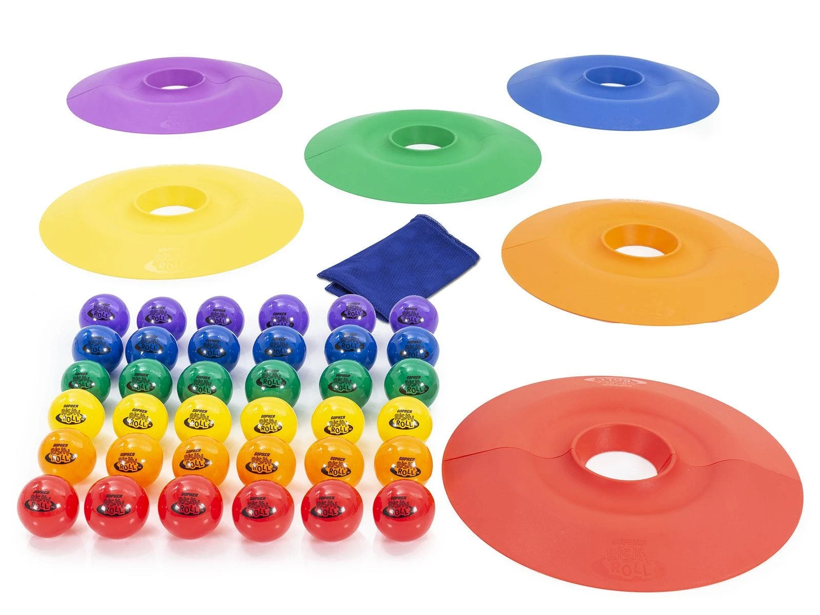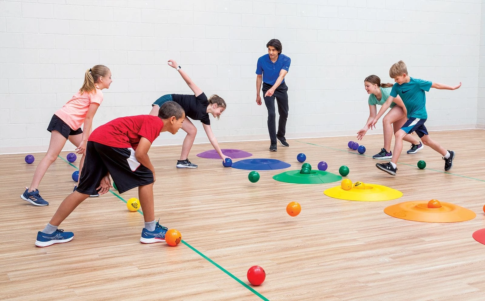Put players touch, control, and accuracy to the test in a strategic rolling ball game. Players gently underhand throw balls in their team color from behind a dedicated rolling line toward their team’s goal. They can play on either side of the goal, allowing players to take shots from different angles. Each ball that lands in the dip around the top of the goal earns 3 points, while landing in the center of the goal loses a point! Players also have to be careful not to knock a ball out of the dip, making it fall off the goal or into the center and losing points. The team with the most points at the end of a predetermined time wins! Change games up from class to class and encourage players to land balls in the center of the goal to earn points, while also allowing opponents to try and knock them out of the goal.
