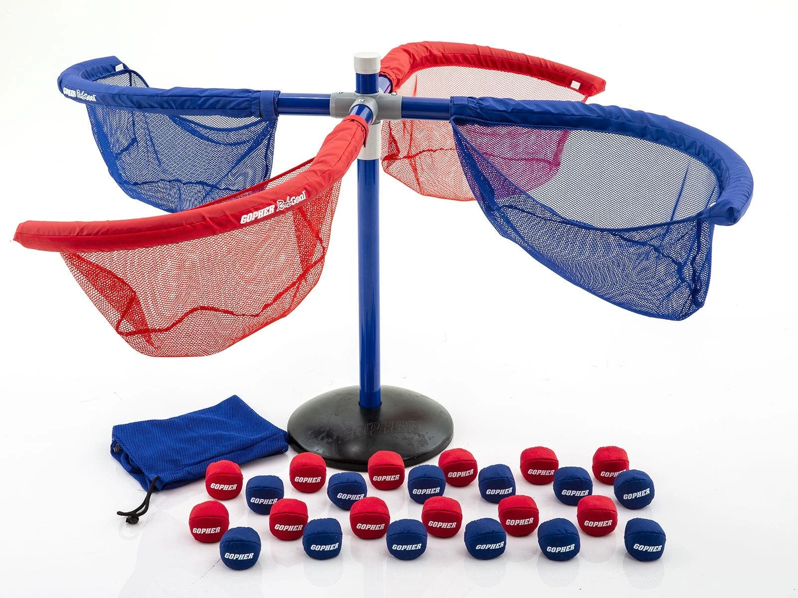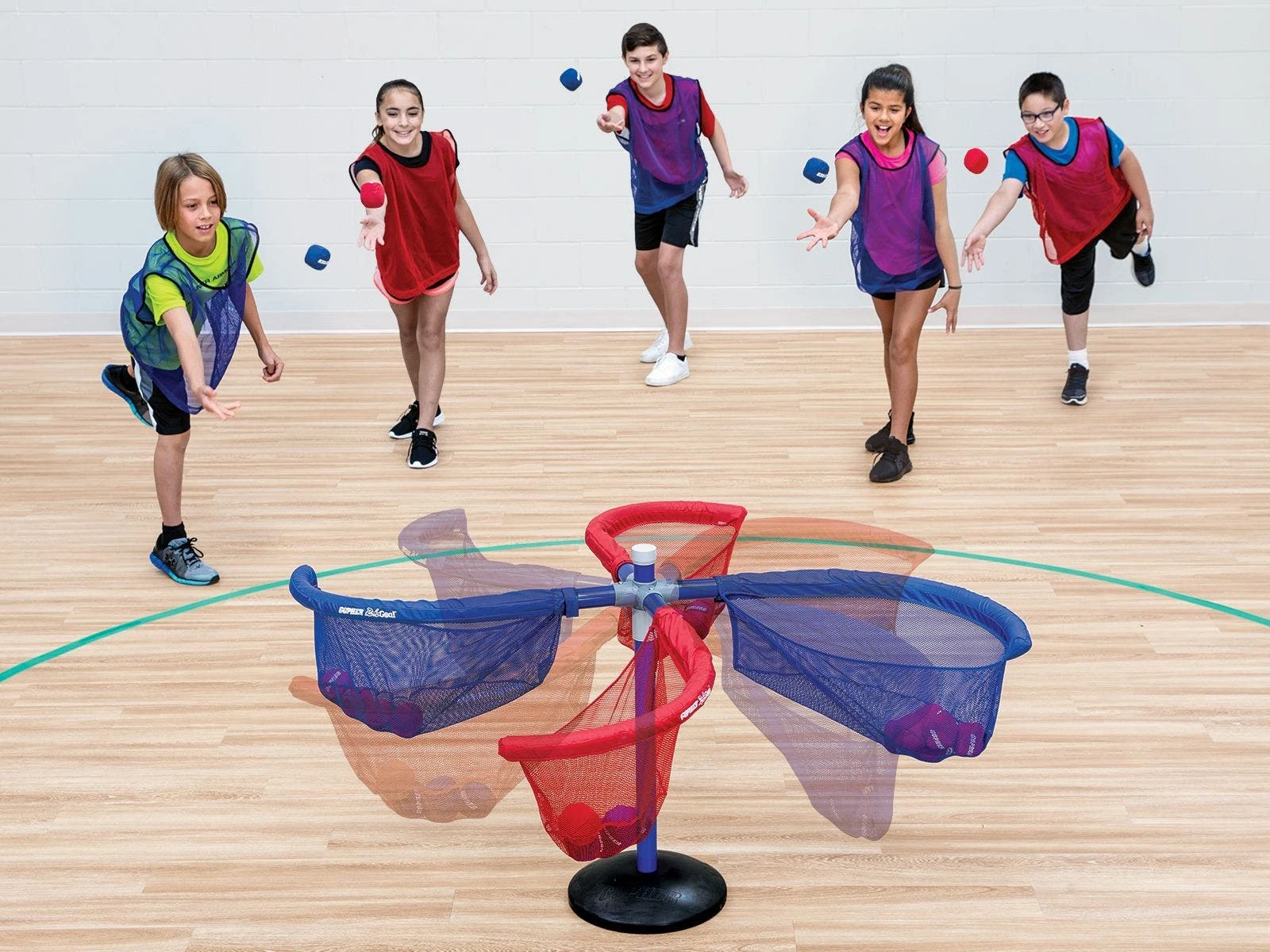 Cooperative games for physical education like RotoGoal teach players how to work together toward a goal. The spinning nets in this game create exciting challenges for players! After the goal starts rotating, players throw balls toward their color nets. But aim carefully! If a ball lands in an opponent’s net, the other team earns double points. The team with the most points at the end of the game wins! Every time a ball lands in the net, that player spins the arms. Easily reconfigure the goal using push pin adjustments to vary the challenge.