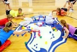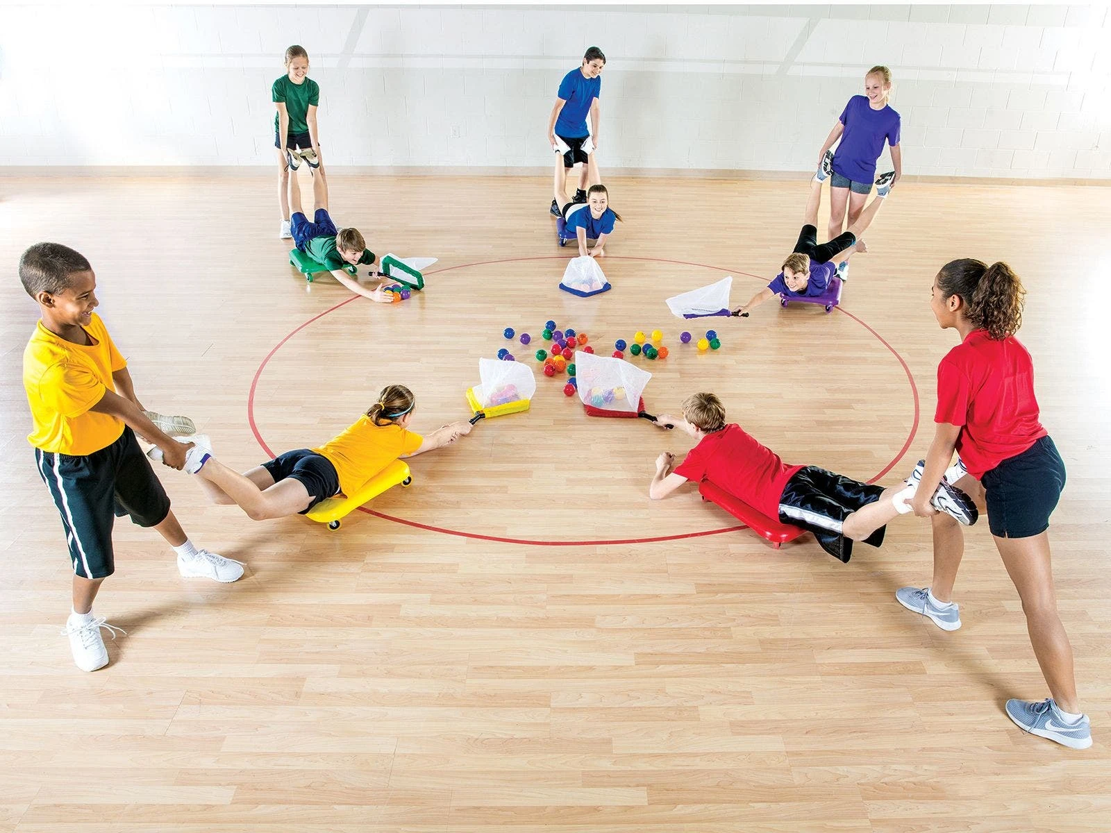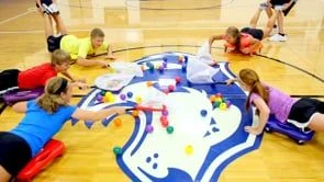 The objective of Scoot-N-Scoop is to be the team with the most balls at the end of the round. One player from each team is the scooper and the other is the scooter. The scooper lies on his/her stomach on the scooter and holds the net in one hand. The scooter holds the scooper’s feet and pushes him/her forward and backward across the playing area. On the signal, all players race toward the center and scoop as many balls into the net as possible and return them to their team’s hoop. Each ball is one point and the team with the most points wins.
