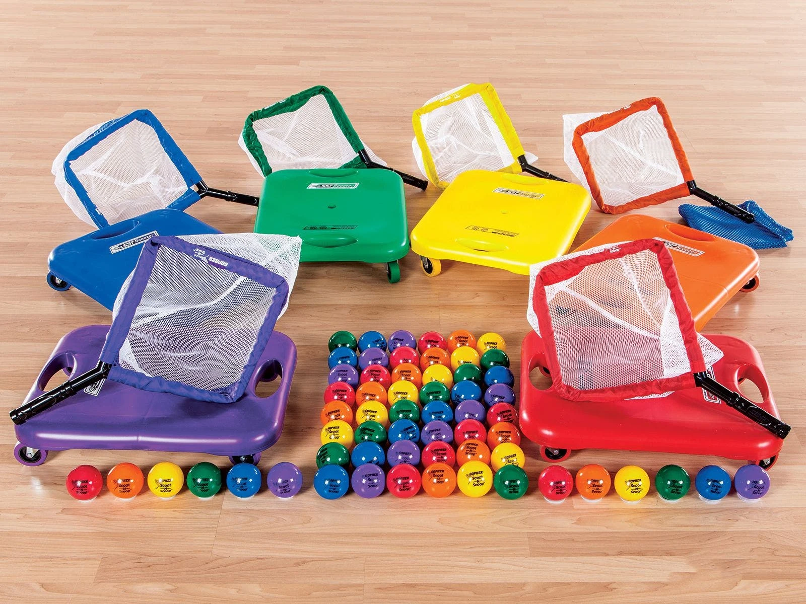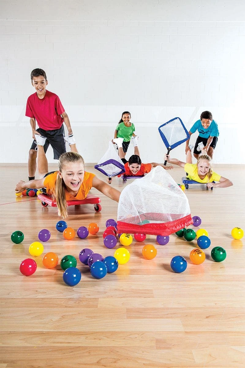 Set includes 6 SST indoor scooters (20-1/2″L x 16″W), 60 balls (2.5″ dia), 6 Scoot-N-Scoop Nets (22-1/2″L x 15″W), a VersaBag mesh storage bag, and activity instructions.