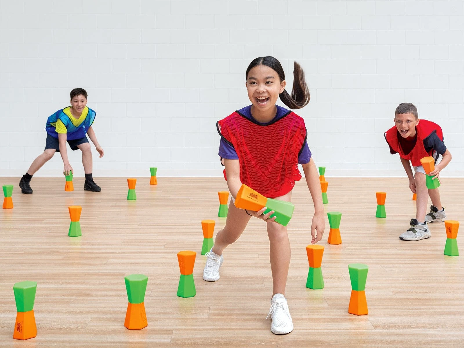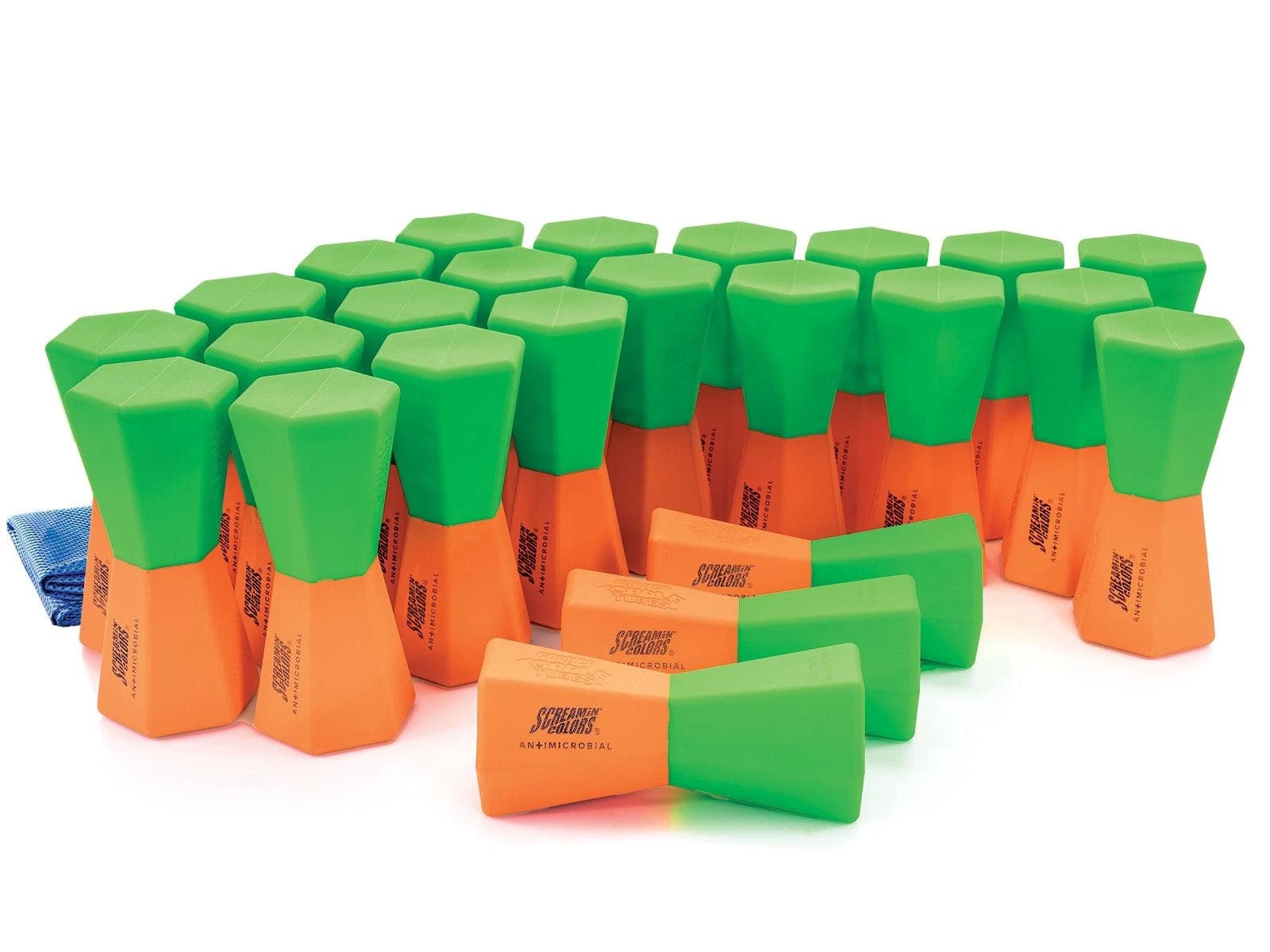 Add even more excitement to team games with brightly-colored tubes. One half is Screamin’ Green and the other is Screamin’ Orange, making it easy to see if your team’s color is on top. Scatter tubes at random around the playing area, ensuring 12 of each vibrant color is up. At the signal, players race to flip tubes so their color is up. The team with the most tubes standing with their color on top at the end of a predetermined time, wins! Teachers can also incorporate the tubes into relays or add variety to fitness circuits.