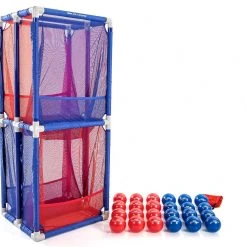 With a four-section and 24 balls in play, this accuracy game requires great aim and constant movement. The color-coded net includes four zones with a red and blue scoring section on each side. Place the goal in the center of a 20’ dia throwing circle around it. Players rush to grab balls in their team color and throw them into the goal. The goal features four color-coded sections, and teams need to aim for the sections in their color in order to earn points. If they throw a ball into their opponent’s sections, the other team earns points. Play continues until all balls are in the goal or time runs out. Each ball in a team’s goal counts as one point. The team with the most points wins!