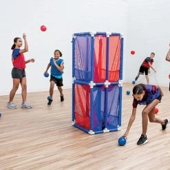 With a four-section and 24 balls in play, this accuracy game requires great aim and constant movement. The color-coded net includes four zones with a red and blue scoring section on each side. Place the goal in the center of a 20’ dia throwing circle around it. Players rush to grab balls in their team color and throw them into the goal. The goal features four color-coded sections, and teams need to aim for the sections in their color in order to earn points. If they throw a ball into their opponent’s sections, the other team earns points. Play continues until all balls are in the goal or time runs out. Each ball in a team’s goal counts as one point. The team with the most points wins!