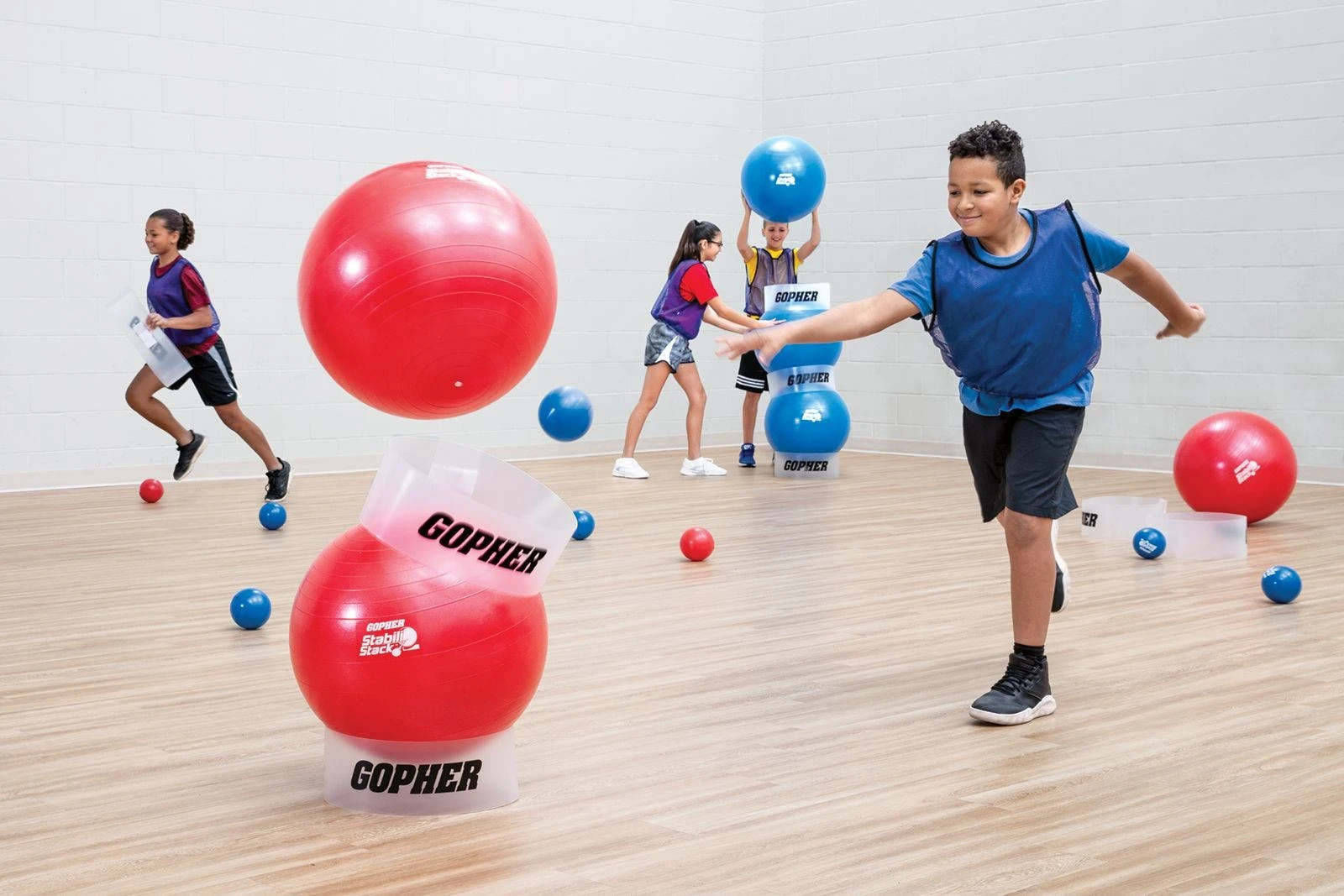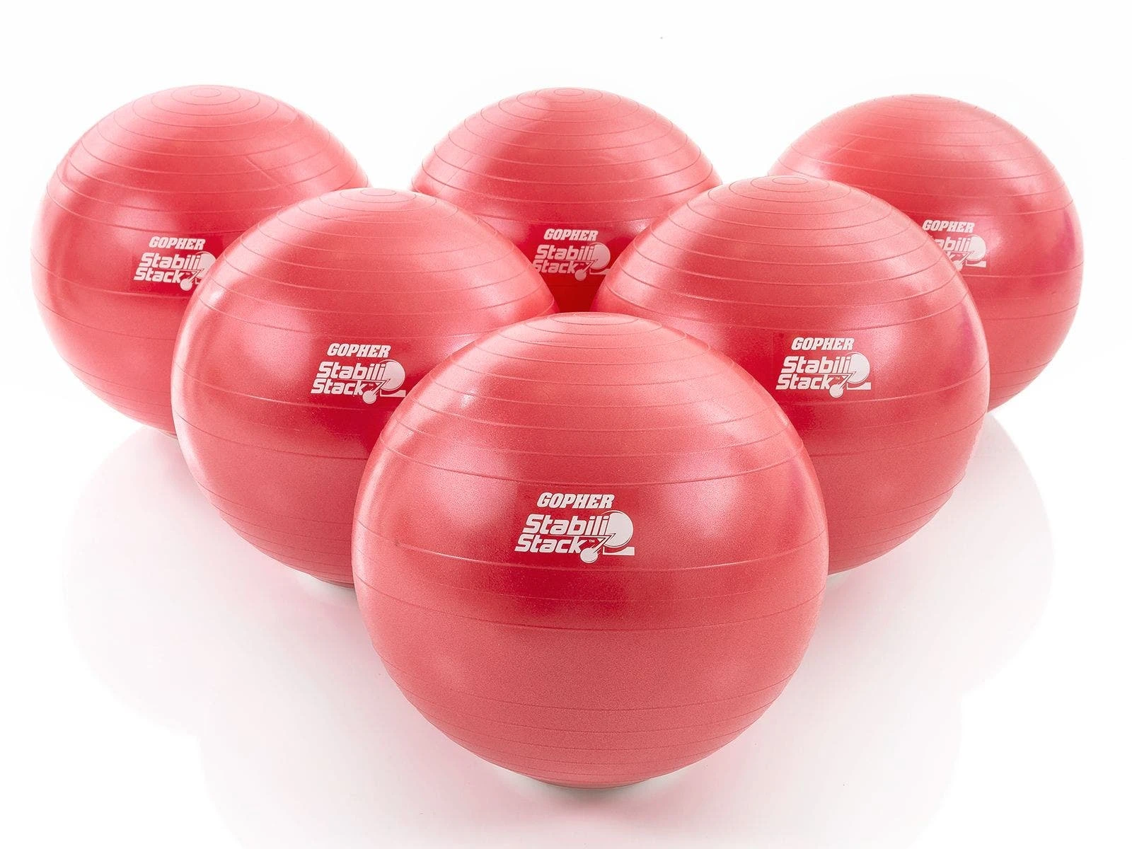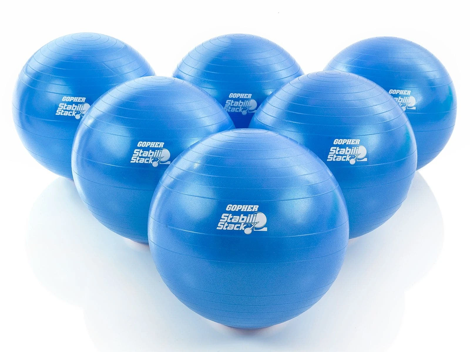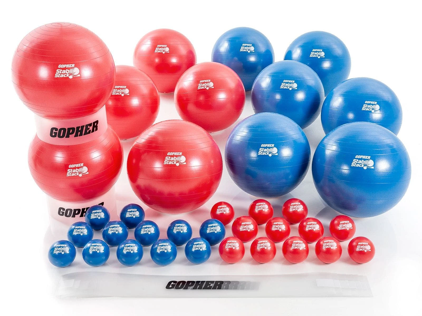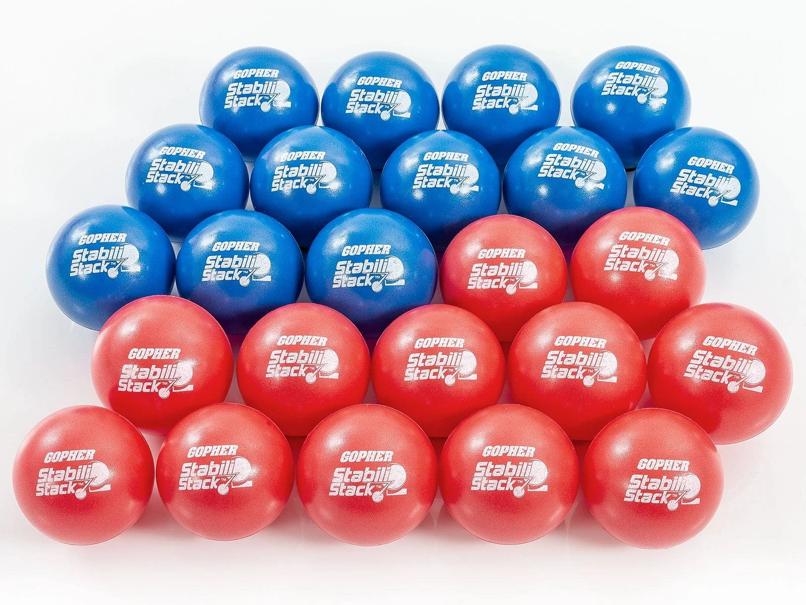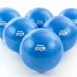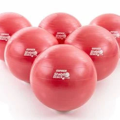 Set includes 12 stability balls (55 cm dia; 6 ea red, blue), 12 ball stackers, 24 vinyl balls, and activity instructions.