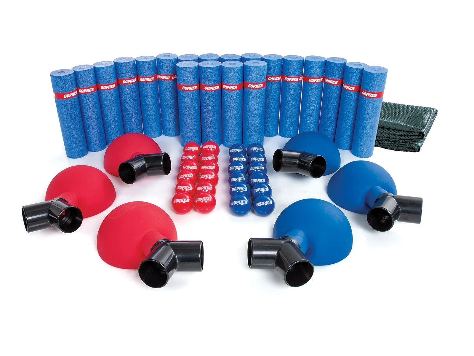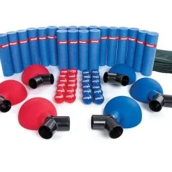 Soft vinyl launchers (12″L x 10″W x 8″H; 2 lb) are designed for double the fun and launch two 3″ dia balls at once. This improves accuracy and players’ chances of hitting the targets, while also increasing the action. Lightweight, high-density foam targets are easy to topple and relocate as needed. Complete Set includes 6 launchers (3 ea red, blue), 24 vinyl balls (12 ea red, blue), 20 foam targets (14-1/4″H x 3-3/4″ dia; 6.8 oz), a VersaBag mesh storage bag, and activity instructions.