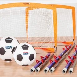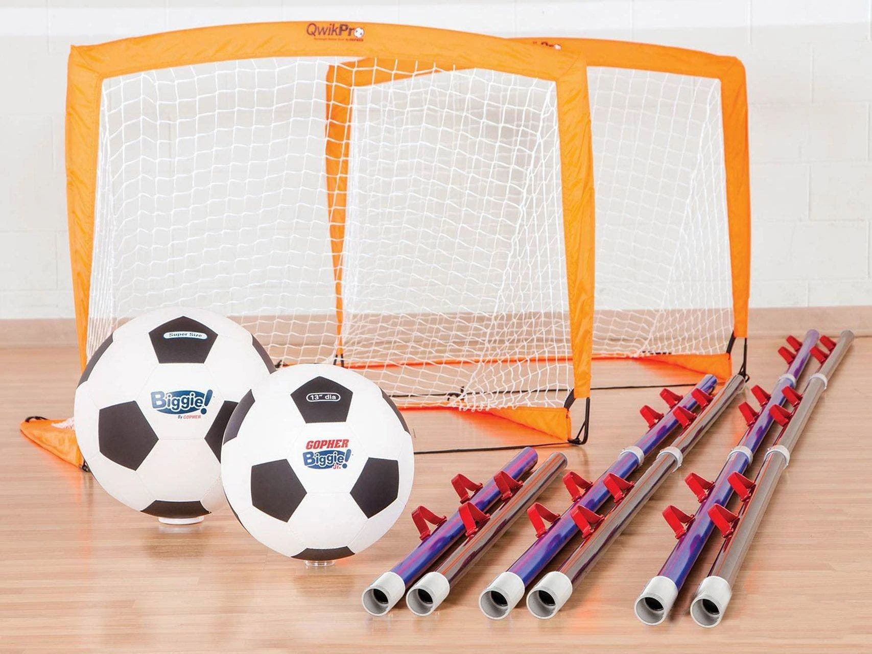 Set includes 12 ABS poles (60-1/2″L ea), 2 QwikPro Pop-Up Goals, 2 Biggie! Soccer Balls, and activity instructions.
