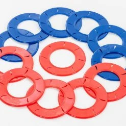 At the signal, teams cooperate to throw 9” dia vinyl discs at the paddles, using momentum to flip the paddles in their team’s color to the top of the goal. The team with more paddles on top after 2 minutes earns 1 point. The team with more points after 10 rounds wins.