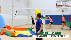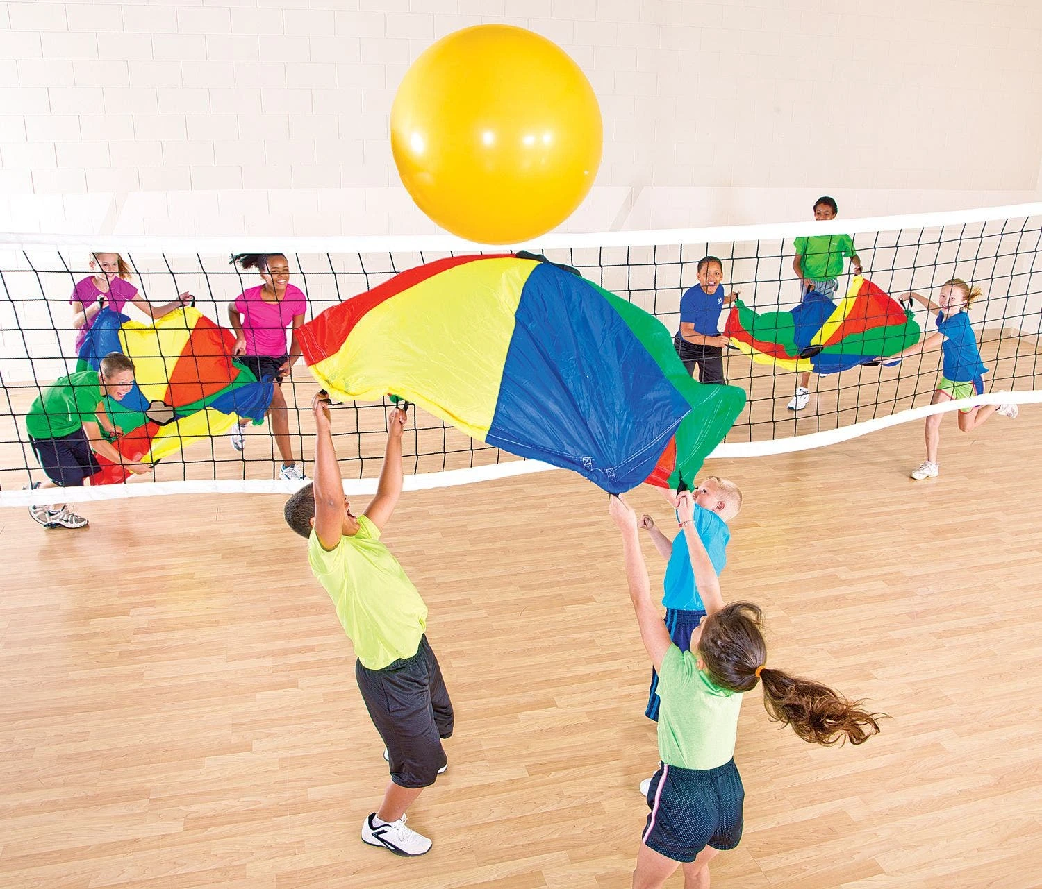During these oversized volleyball games for schools, assign 3 parachutes per side and at least 3 players to each parachute. Teams work together to play volleyball with the included cage ball. Players can either catch and move the ball using only the parachute; they cannot use their hands. One team serves, and the other team works together to catch the ball and launch it back over the net. If the ball hits the floor, the serving team earns a point. Scoring is similar to regular volleyball. Play games to 15, and a team must win by a 2-point margin. The game requires students to be able to work together in small and large groups.