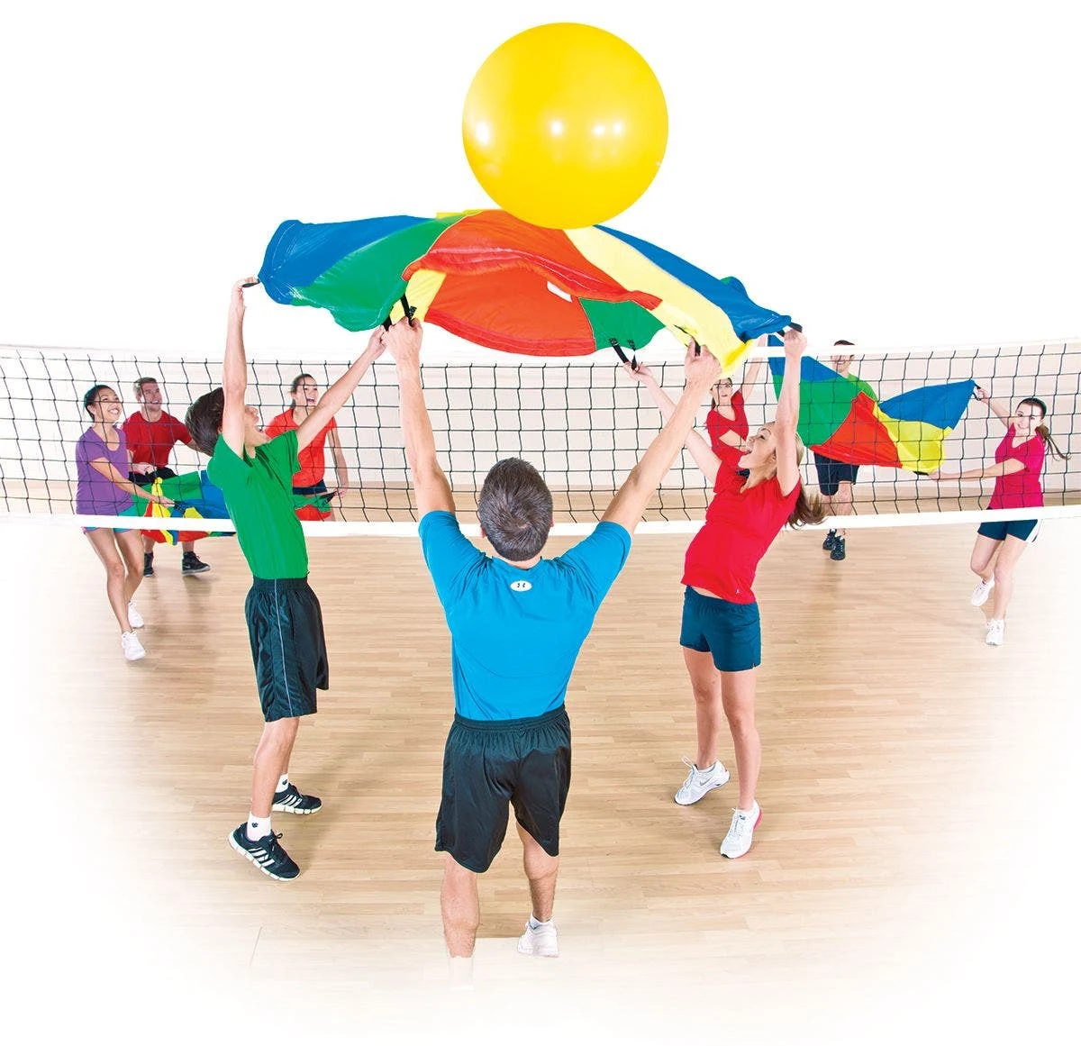 Bring exciting, unique volleyball games for physical education to your class with a huge ball certain to get your class excited for participation! In this challenging variation of volleyball, up to 18 players use parachutes to attempt to catch the oversized ball once it’s been served. Teammates will practice communication and cooperation to position their parachutes properly, and team strength is necessary to launch the ball back to the opponent’s side.