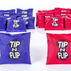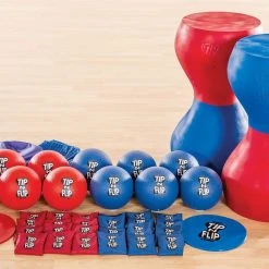 The most unique component of this game is the Tip-N-Flip stand. This custom item was created specifically for this game. It is two-colored (half red, half blue) to designate different teams. The top and bottom are both concave, allowing it to better hold beanbags and other objects. The ends are also weighted for added stability and durability during game play.