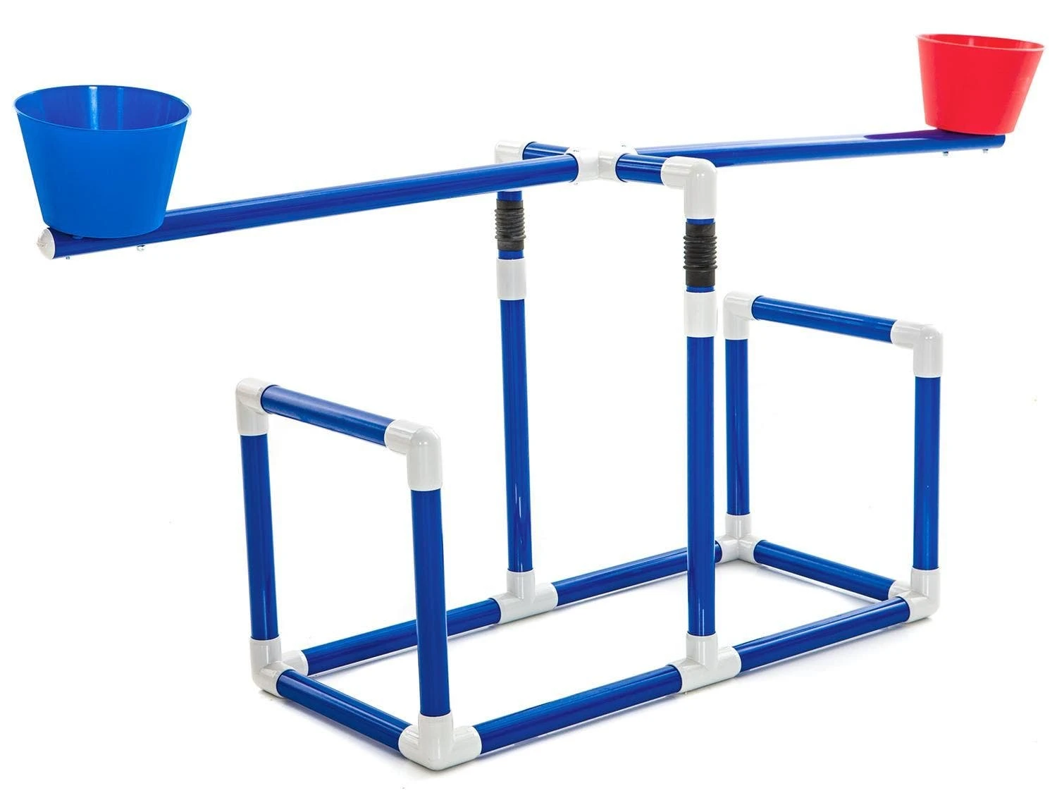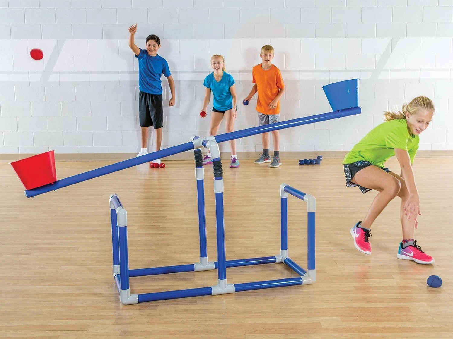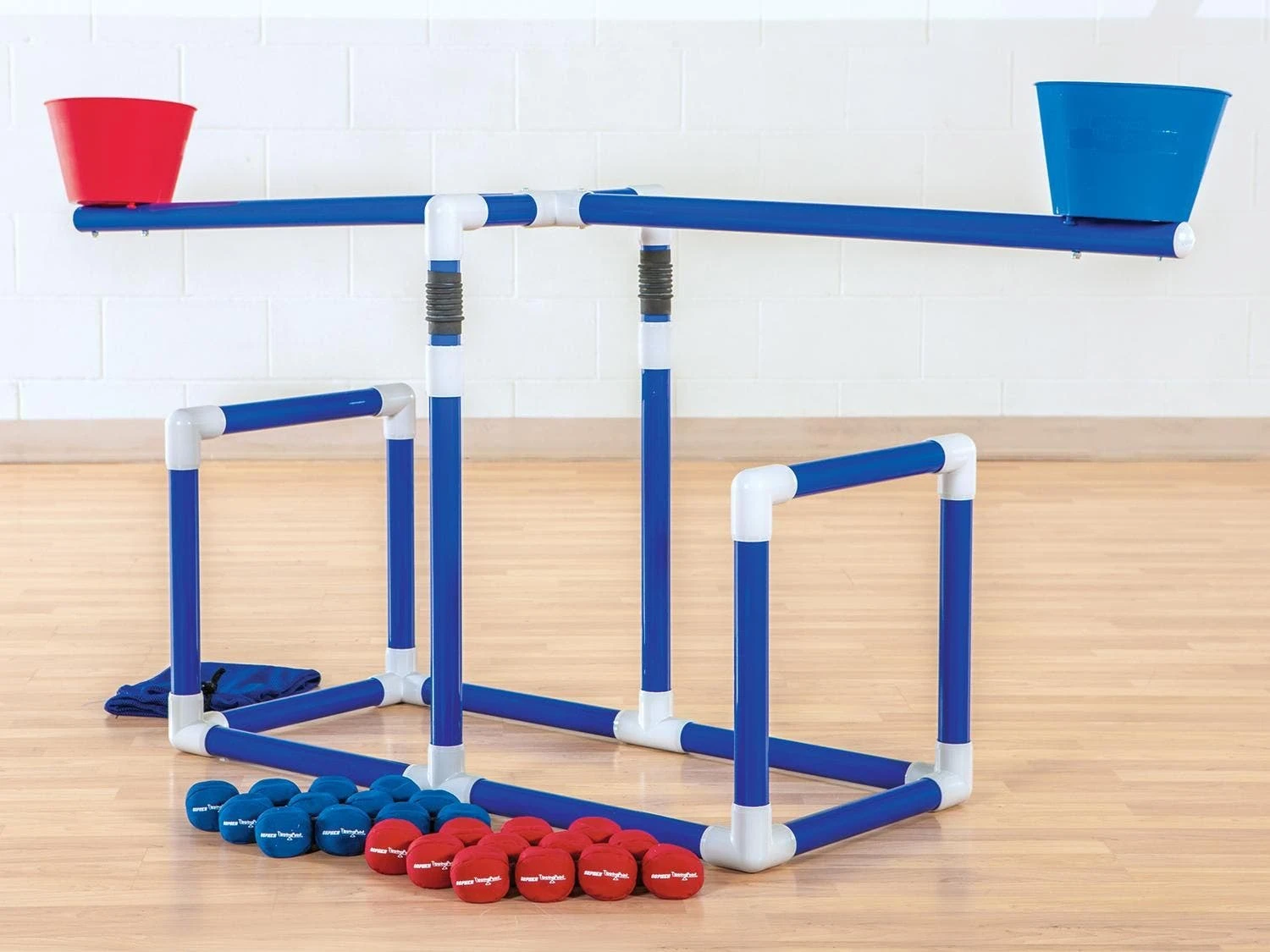 It’s a relay race to see which team can make the buckets hit the tipping point faster! Players stand parallel to the goal and take turns tossing balls into their team’s bucket. As each ball lands in a bucket on one side, the bucket on the other side raises. If a player misses a shot, he/she quickly retrieves the ball and gives it to the next person in line. The team that tips the bucket in its favor when time runs out, wins!