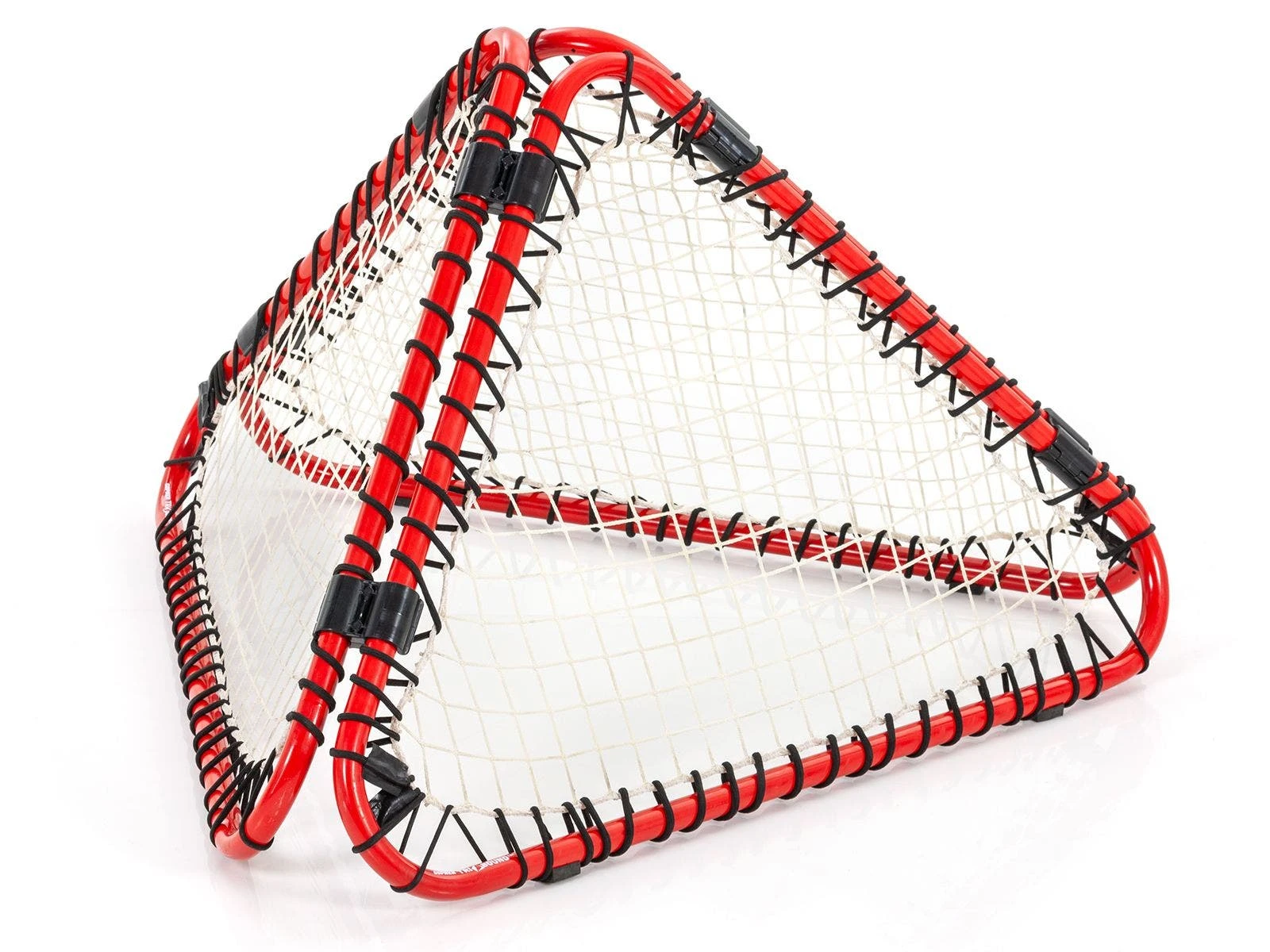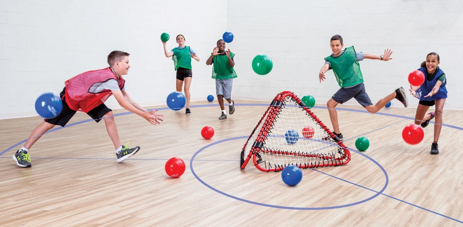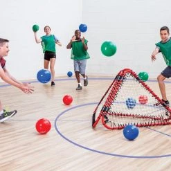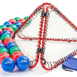At the signal, players throw balls at our pyramid-shaped rebounder, in the center of the play area, causing a bombardment of rebounds in every direction. Three teams aim for their two adjacent opponents’ zones while strategizing to protect their own. Balls (7″ dia) that land in an opposing zone (outside the 5’ dia throwing circle) score 1 point for that team and are out of play. But if the team catches the ball, no points are given, and it remains in play! The team with the fewest points by the end of the game wins.