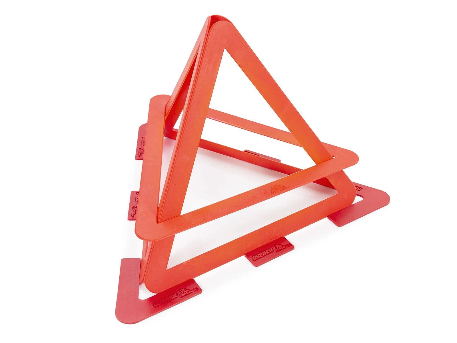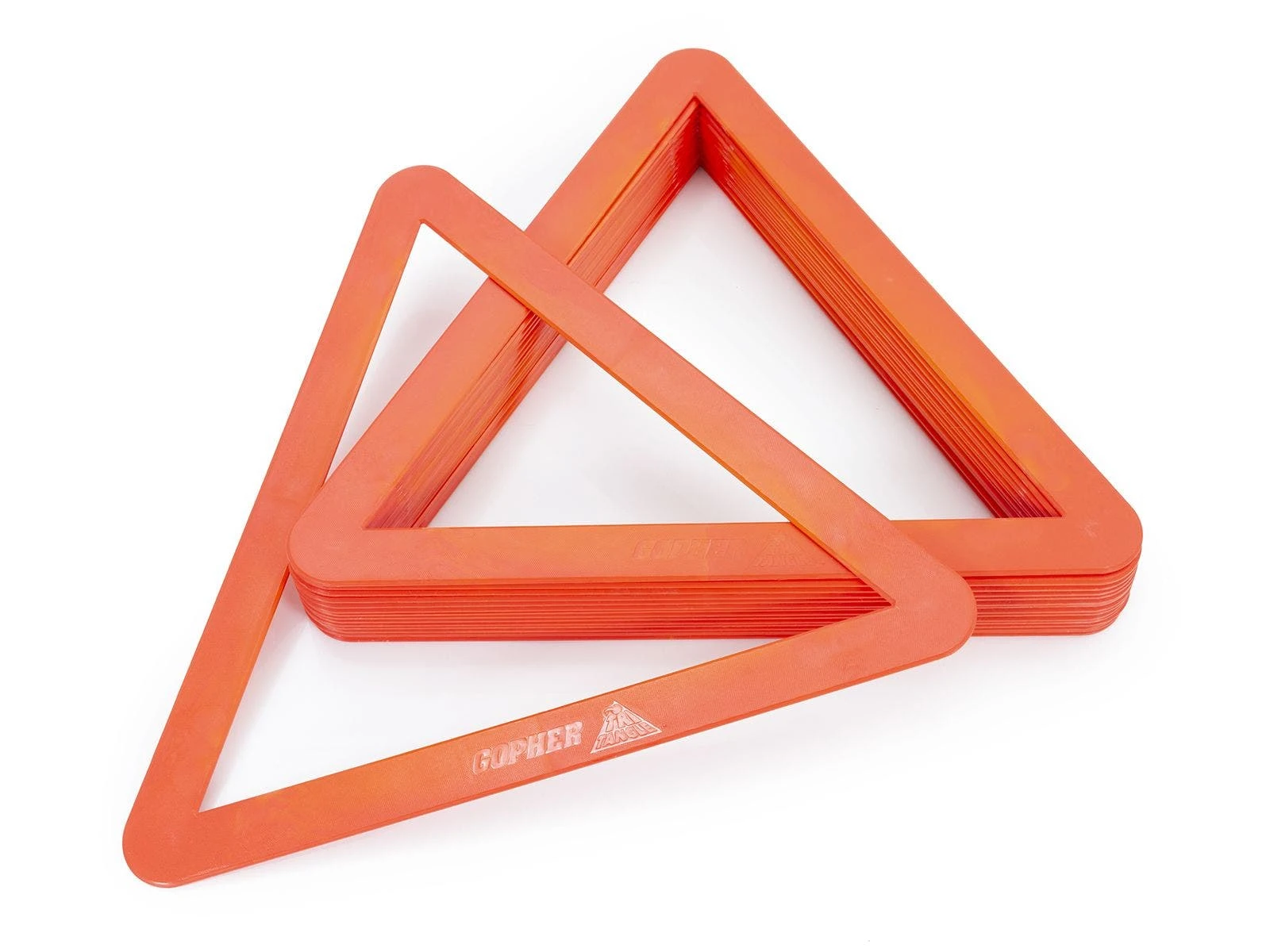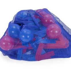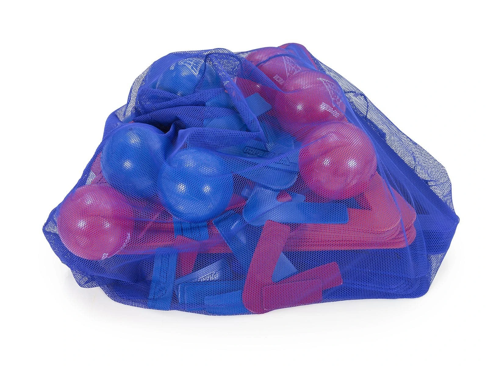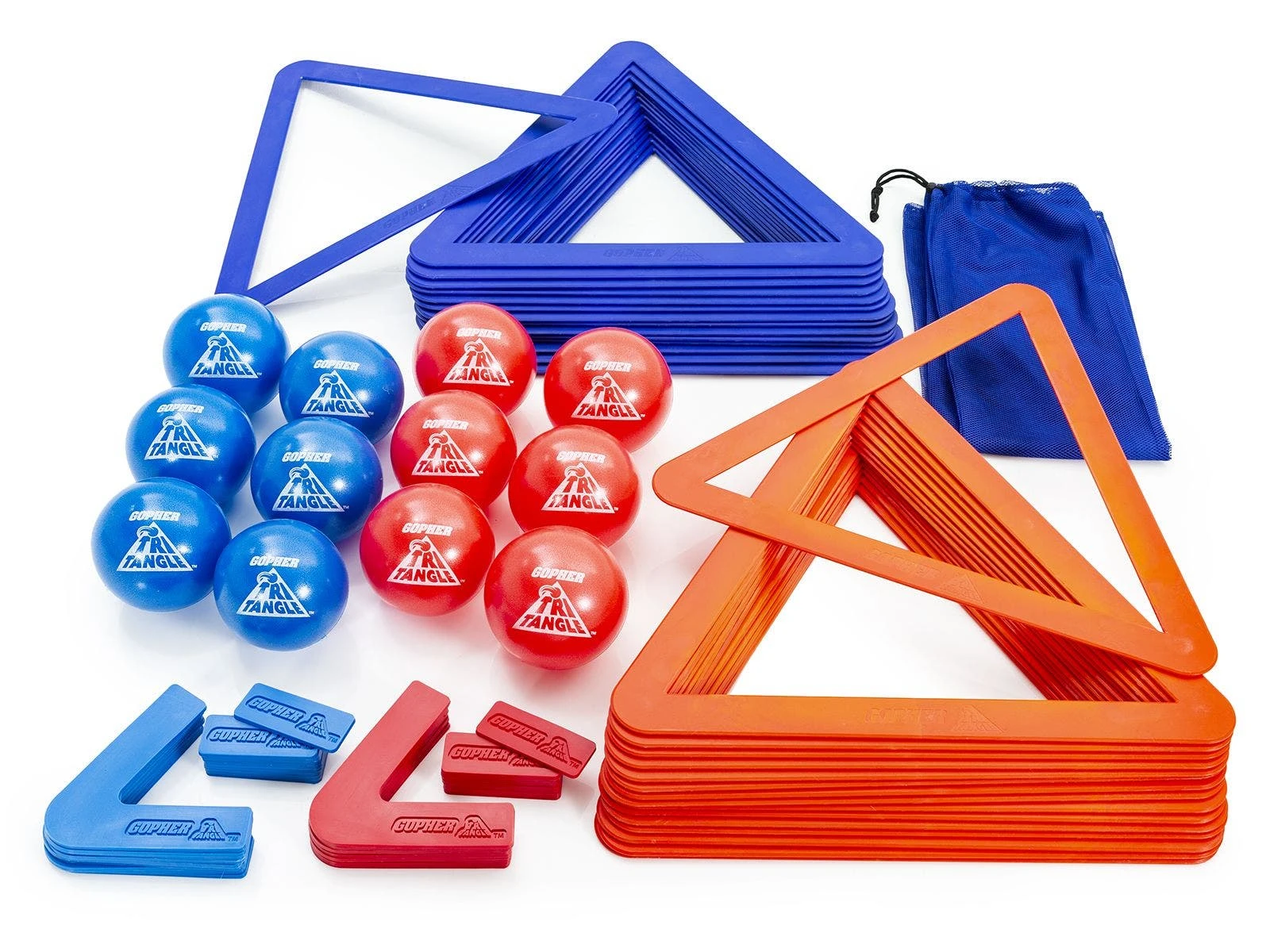 Molded polypropylene plastic triangles (33″W x 29″H x 1/4″ thick; 1/2 lb ea) are textured for added grip. Poly pieces include corners and bars (4″L x 2″W), allowing players to choose the pieces that work best for their base. Set includes 32 triangles (16 ea red, blue), 36 poly pieces (18 ea red, blue), 12 inflatable AirFoam balls (6″ dia; 6 ea red, blue), a VersaBag mesh storage bag, and activity instructions with game variations.
