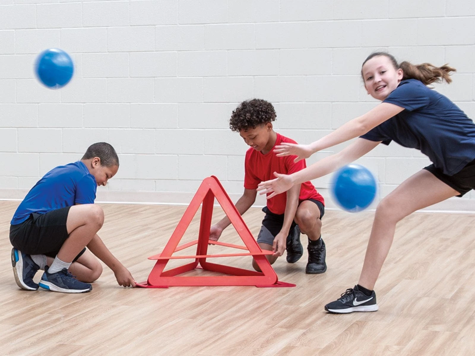 Be quick and try not to get tangled up with opponents while grabbing triangles, poly pieces, and balls from the center court line during this building game. Players use 3 triangles to build pyramids and place the poly pieces around the base to anchor the structure. At the same time, players defend their pyramids as the other team throws balls at them, trying to knock down the structures. The first team to build all four of its pyramids and keep them standing for four seconds, wins! Teachers can also increase the number of teams, while decreasing the number of pyramids per team, for an engaging small sided game. Another activity incorporates a relay race as players run to collect pieces and build pyramids.