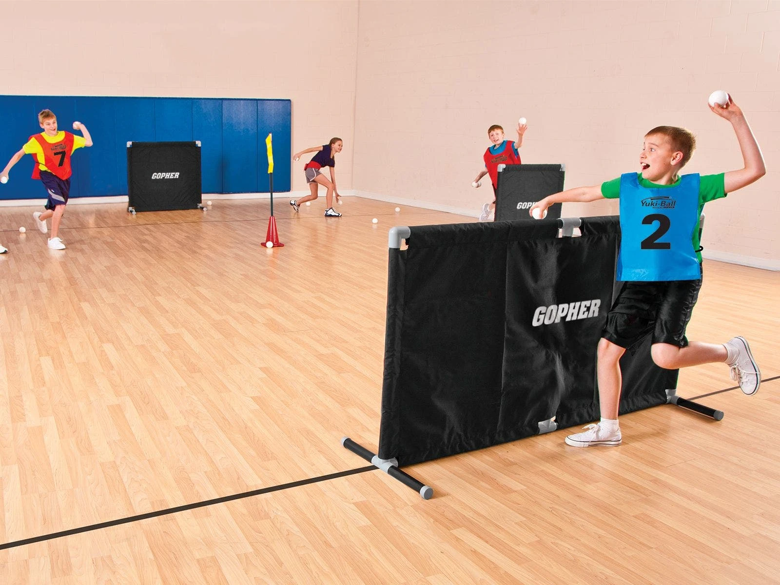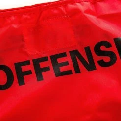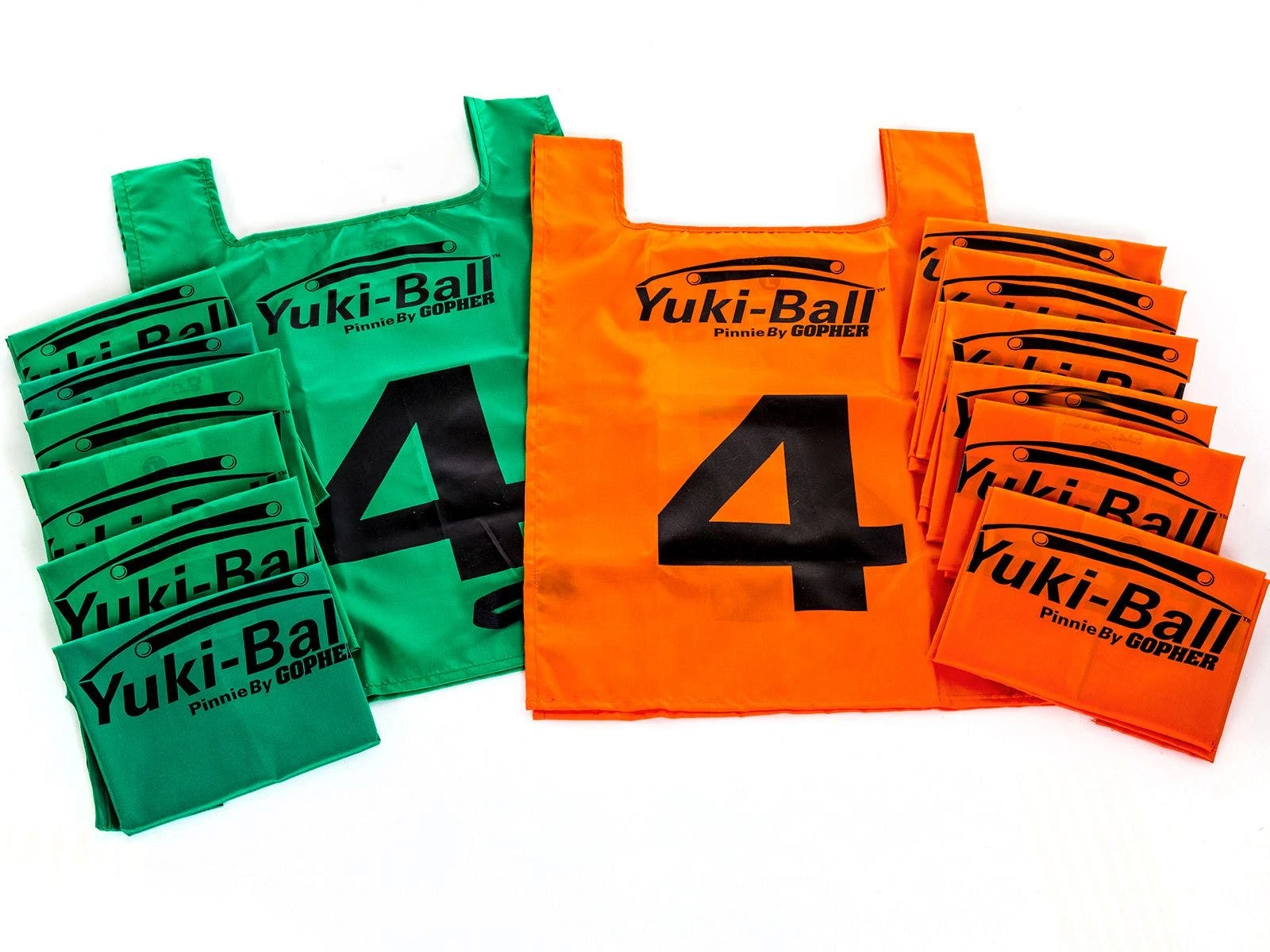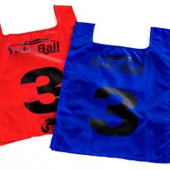 The medium-size, nylon pinnies are available in red/blue for indoor games or green/yellow for outdoor games.