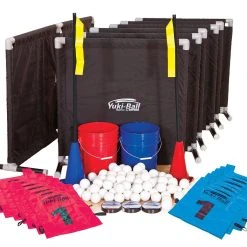 Set includes 90 indoor balls (3.5″ dia), 7 barriers (6 ea 36″W x 36″H, 1 ea 72″W x 36″H), 2 flags, 2 vinyl cones, 14 pinnies (7 ea red, blue), 2 buckets, 3 rolls floor tape, and activity instructions.