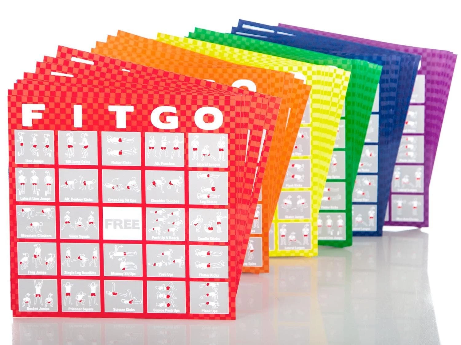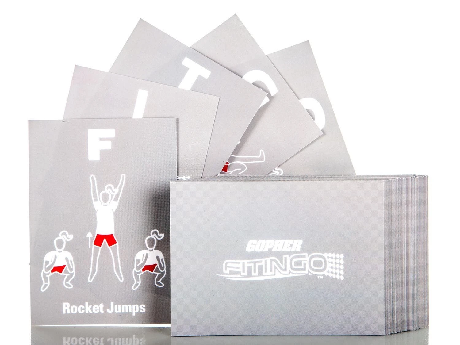 Play a fun, traditional game with a fitness twist! After the instructor calls the letter and movement in this fitness bingo game, players find the matching square on their cards, perform 5 reps of that movement, and then cover the square with a Fitingo Chip. When a player covers 5 squares in a row, he/she shouts “FITINGO” and wins the game! Fitingo game cards have 25 squares with 65 different exercises in the mix!