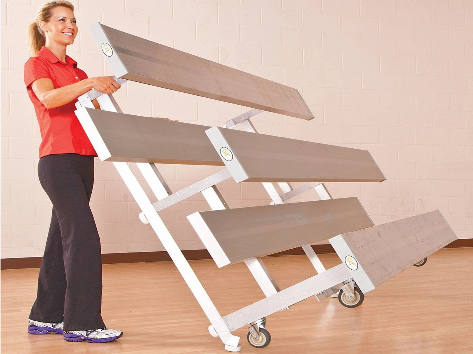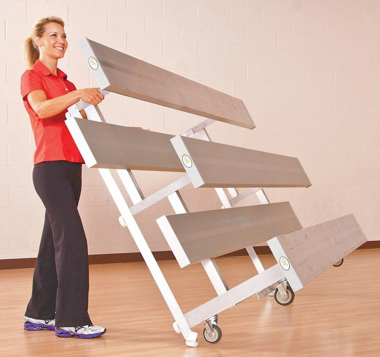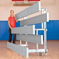 Roll these lightweight aluminum bleachers into place and tip them down for instant seating. When more space is needed in a gym, simply tip them back up and wheel them away again.