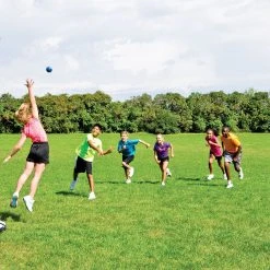 This high-energy game is often used by NFL players to improve their personal conditioning. Score a point by knocking the ball off the other team’s goal. Players run freely with the AngleBall until tagged, then must pass to a teammate. All shots in these outdoor games for kids must be taken outside the 10’ radius of the goal. Create aerobic games indoors or out, and get the whole class involved with this AngleBall game!