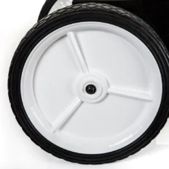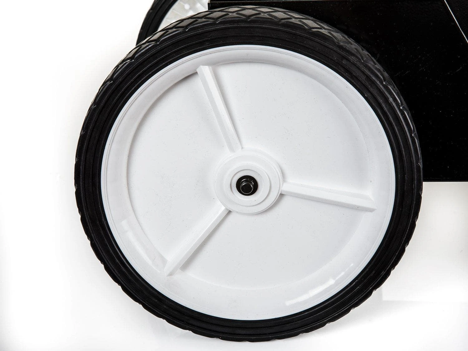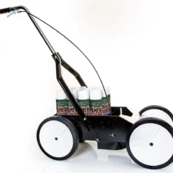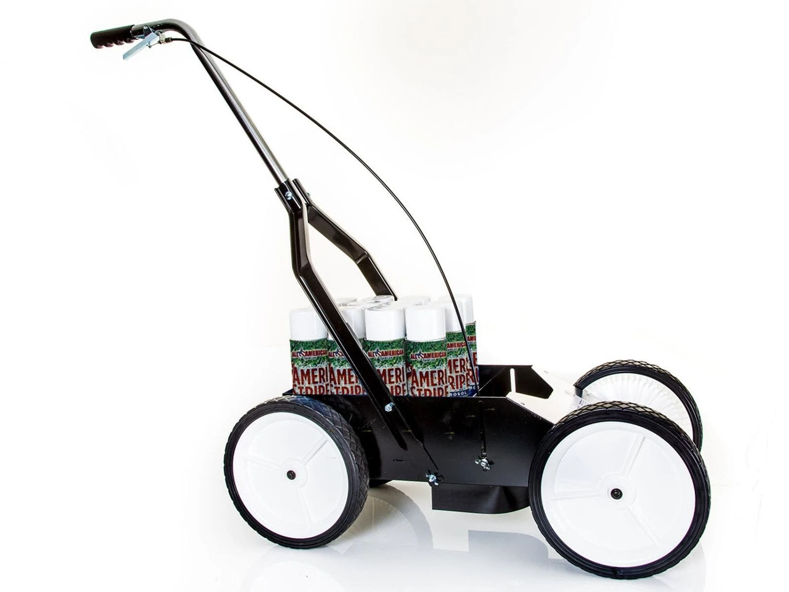 Double your speed when spraying paint stripes on a field. This application system sprays paint at a 90-degree angle, allowing for even coverage in a single pass. Simply hold the on/off lever on the handgrip to operate. Spray nozzle adjusts in seconds for 2″ or 4″W stripes. Four 10″ easy-rolling wheels travel smoothly over rough surfaces. The frame and handle are made with sturdy 18-gauge steel to add strength and durability. Uses spray paint cans, sold separately.