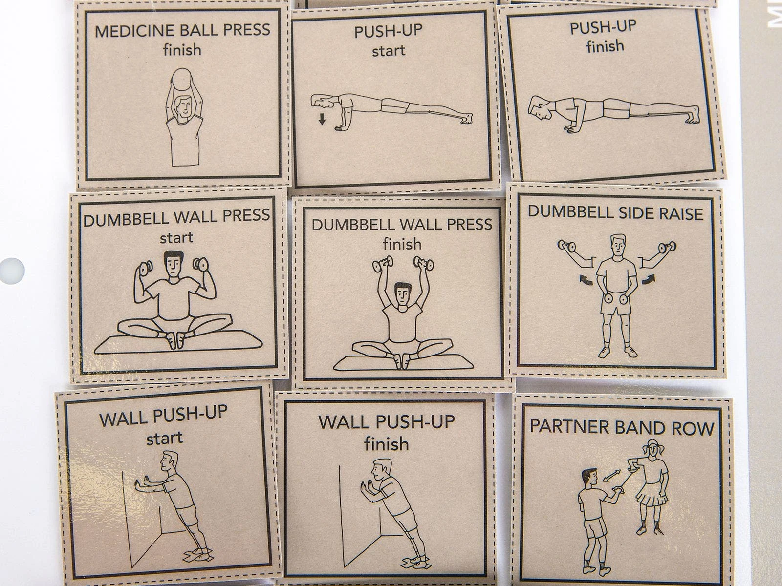 Packs include small visuals with hook-and-loop fasteners on back for use with included exercise schedules, first-then sequential activity boards, and countdown boards. Hold or post large visuals for the entire class to reference and clearly communicate an adapted activity. All visuals and boards provide structure, communicate expectations, and signify time passing.
