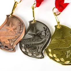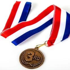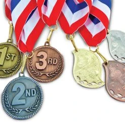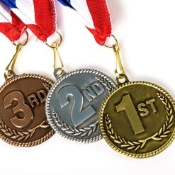 Finely crafted metal makes these medals very durable. 3D graphics stand out, while the gold, silver, and bronze colors clearly signify what place the medal winner achieved. Medals are also suitable for engraving on the back to personalize the special achievement. Traditional circular medallions are 2″ dia. Available in a Set of 3 with one of each color or individually. The ribbons are 30″L x 1-1/2″W. Graphics may vary.