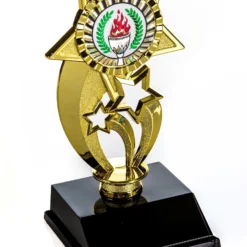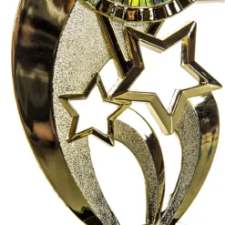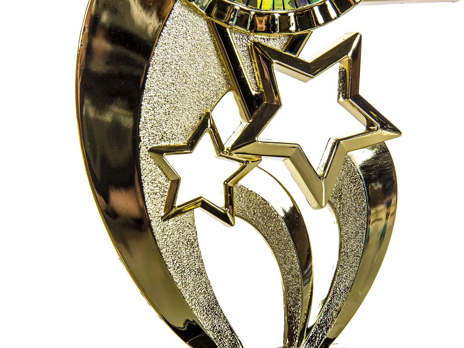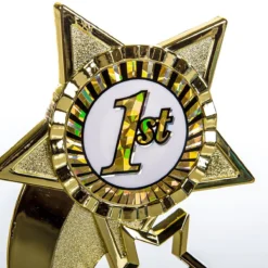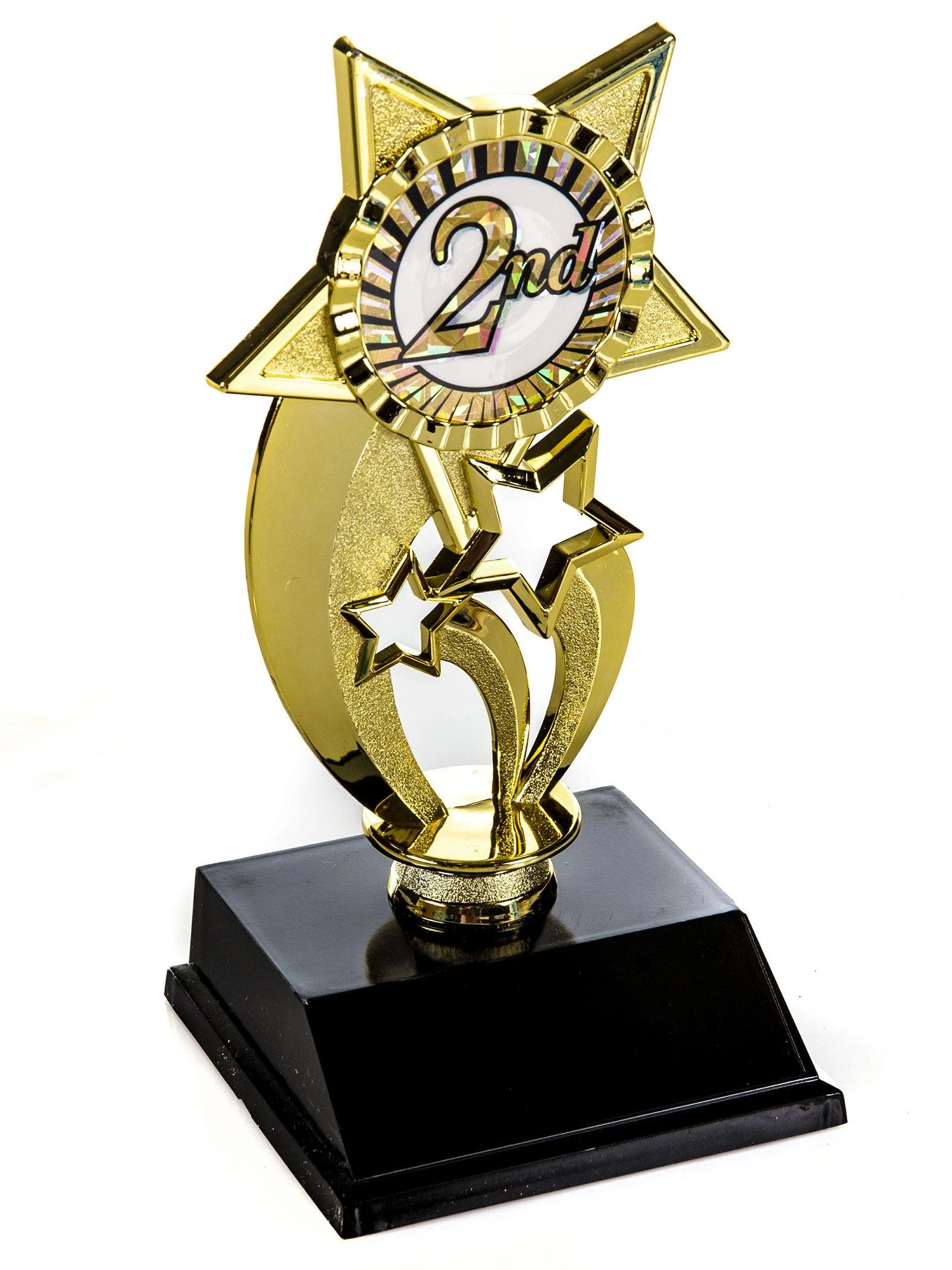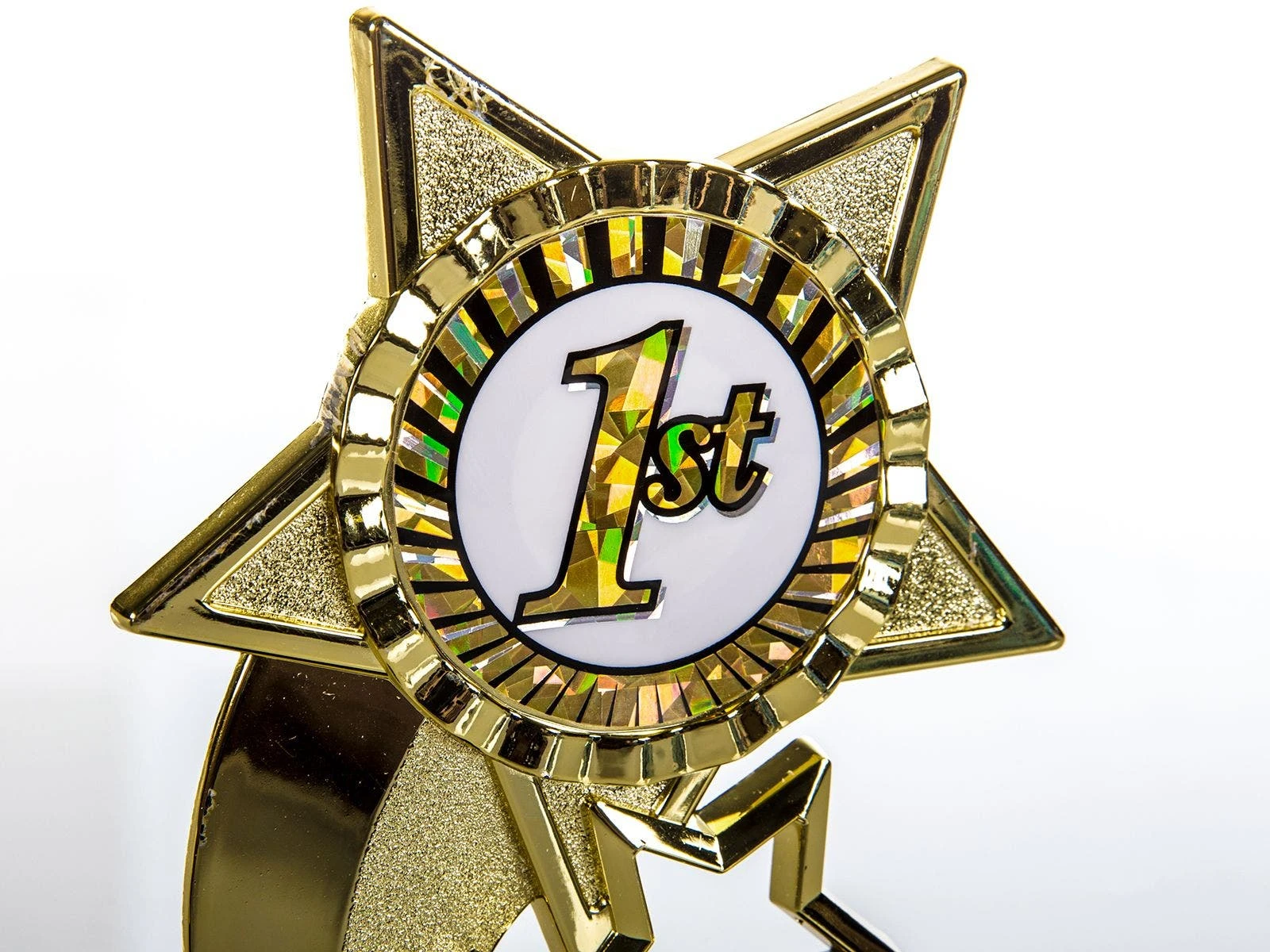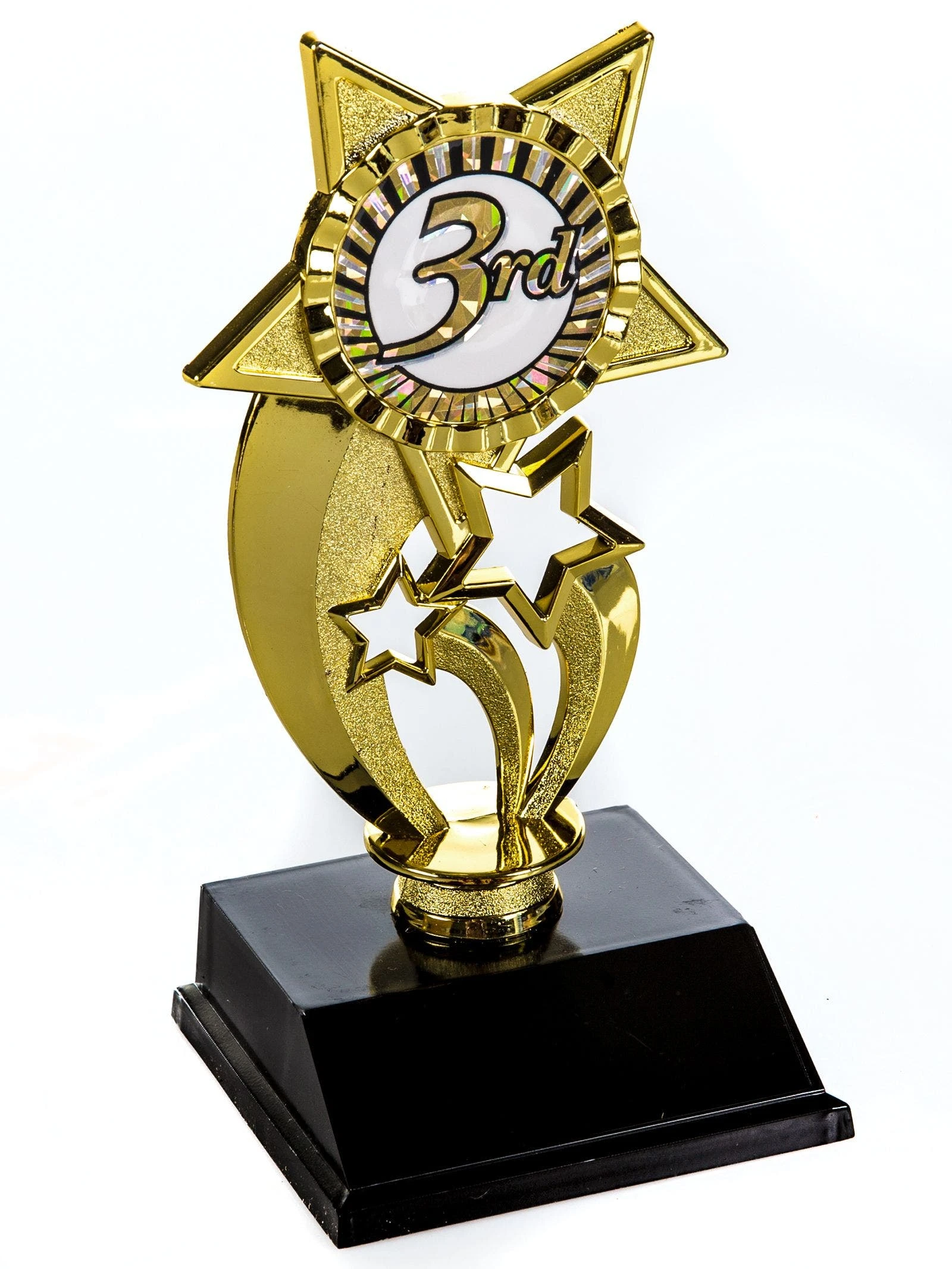 These trophy awards stand the test of time thanks to great construction. A weighted black base features a hole that bolts into the gold feature, keeping everything fastened tightly together. All include a bright gold finish with a sunburst hologram insert.
