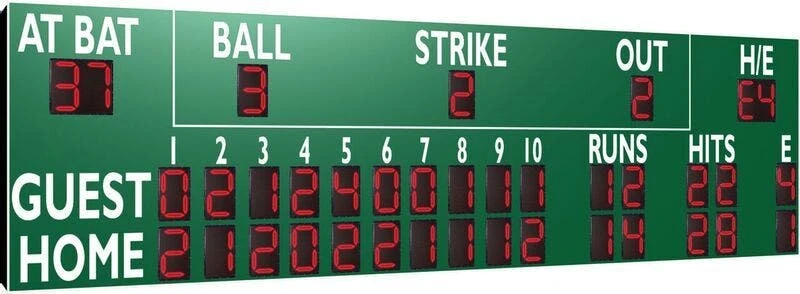 This scoreboard features individual scores for home and guest teams by inning (up to 10), making it easy to follow along with the game. Board also displays balls, strikes, outs, runs, hits, and who’s at bat. Its 15″H numbers have a wide viewing angle and can be seen from 300′ away. Lights have a 100,000 hour rating.
