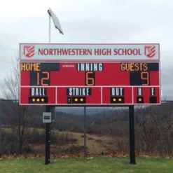 Both scoreboards display pitch count, outs, score, innings, and home/guest. 1600 Series allows for custom team names. Energy-efficient LEDs are clearly visible and storm protection allows for play during storms.
