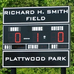 - 1,600 Series is 16’L x 5’W x 8″D with 18″H digits. Available with or without the option to electronically display team names.
