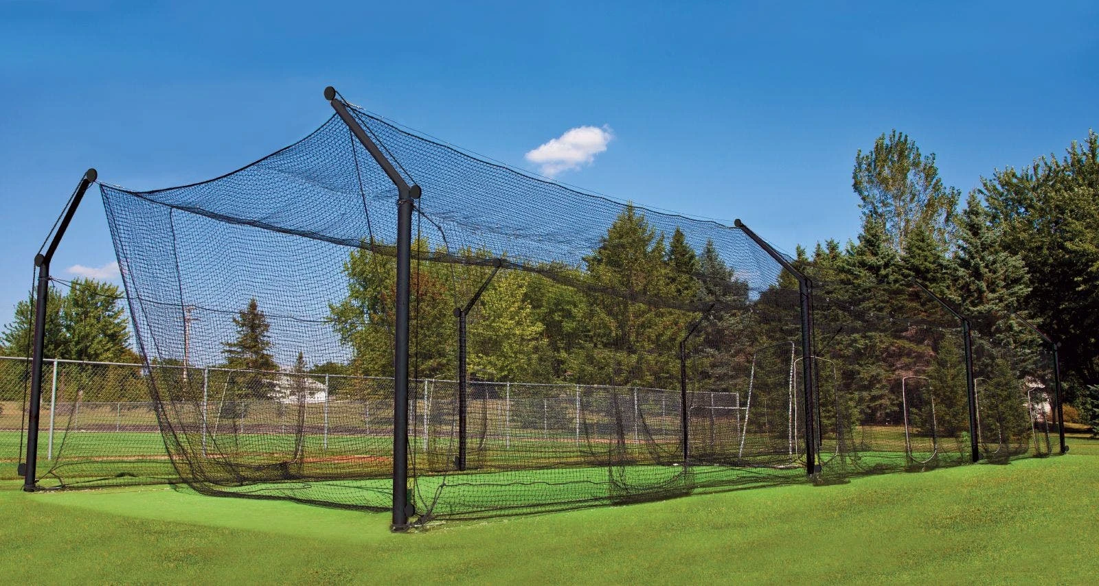 Provide your team with a set of heavy, synthetic-filament polyethylene fiber nets. Permanent black nets are 100% waterproof and UV-treated for long-lasting durability. Nets have 1” sq mesh and three top ropes to prevent sagging. The outdoor cage frames are made of a sturdy steel and are available in softball (55’) and baseball (70’) lengths.