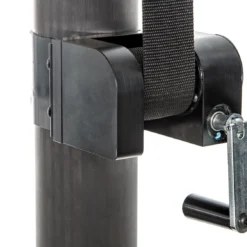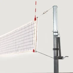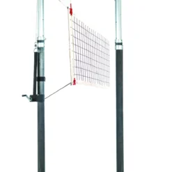 One-of-a-kind hybrid system has a 3-1/2″ dia upper post made of carbon fiber and a 3″ dia aluminum lower post. Quickly adjust the net height with an inner telescoping pole that uses an internal bevel gear, lead screw mechanism, and a non-removable winch handle. The inner telescoping pole includes an engraved net height indicator with markings for men’s, women’s, and youth leagues.