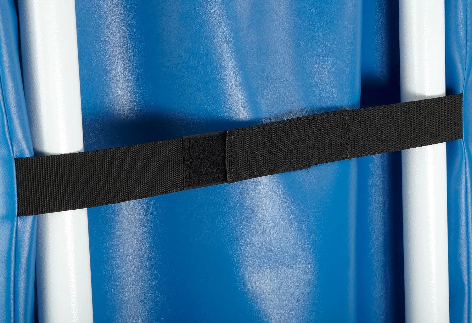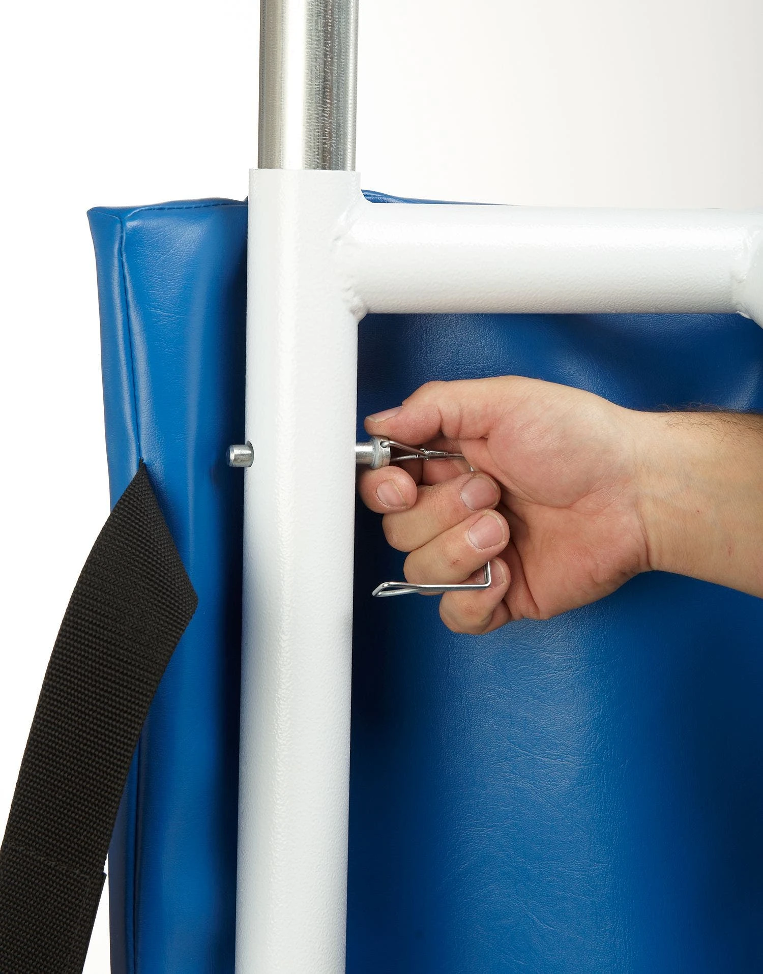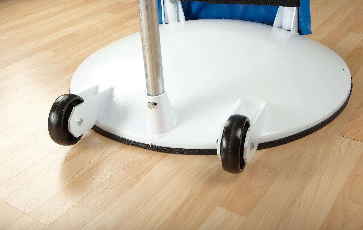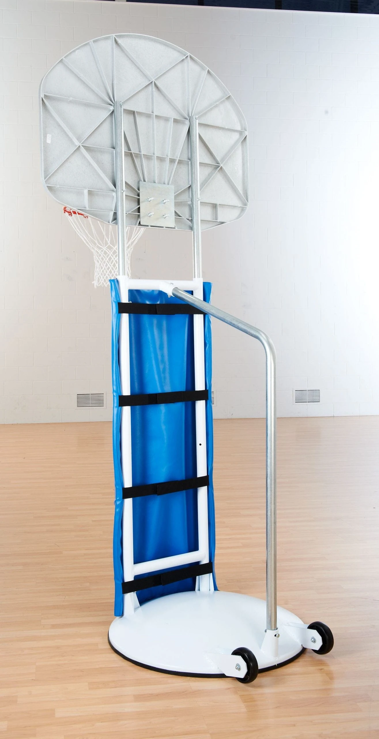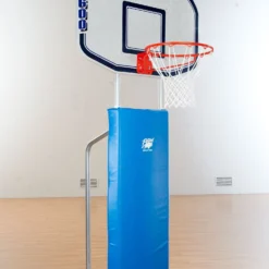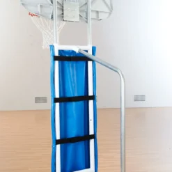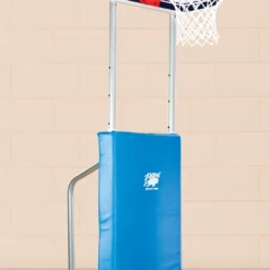 White, powder-coated steel base and steel posts are resilient during use in institutional settings. Base trim acts as a safety buffer between the system and gym floors to prevent marring. Secure the vinyl-covered foam post padding around the frame with hook-and-loop fasteners.