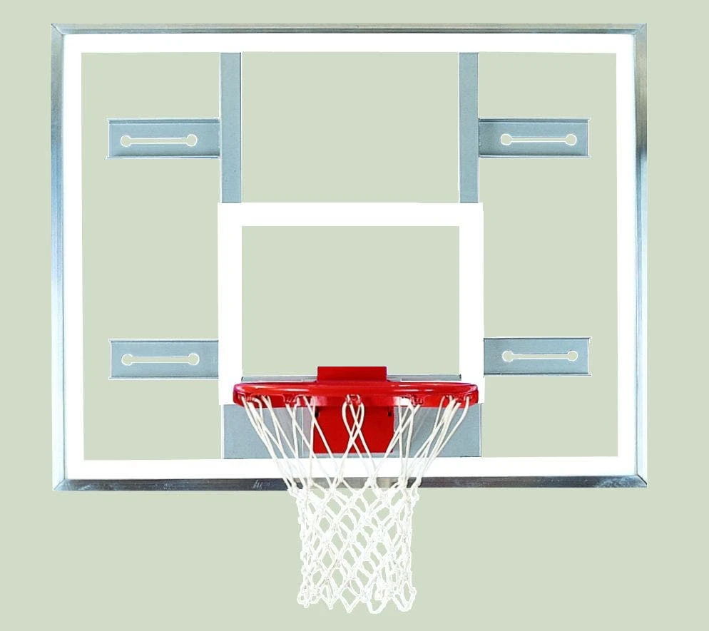 Bison’s side court backboard provides competition-quality performance and converts fan-shaped boards to the popular rectangular glass shape. Simply remove the previous fan backboard and mount this rectangular backboard to the existing structure without drilling or realignment. Welded steel support extends the life of the backboard. Off-glass goal mounting provides security and safety from board breakage.