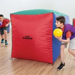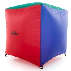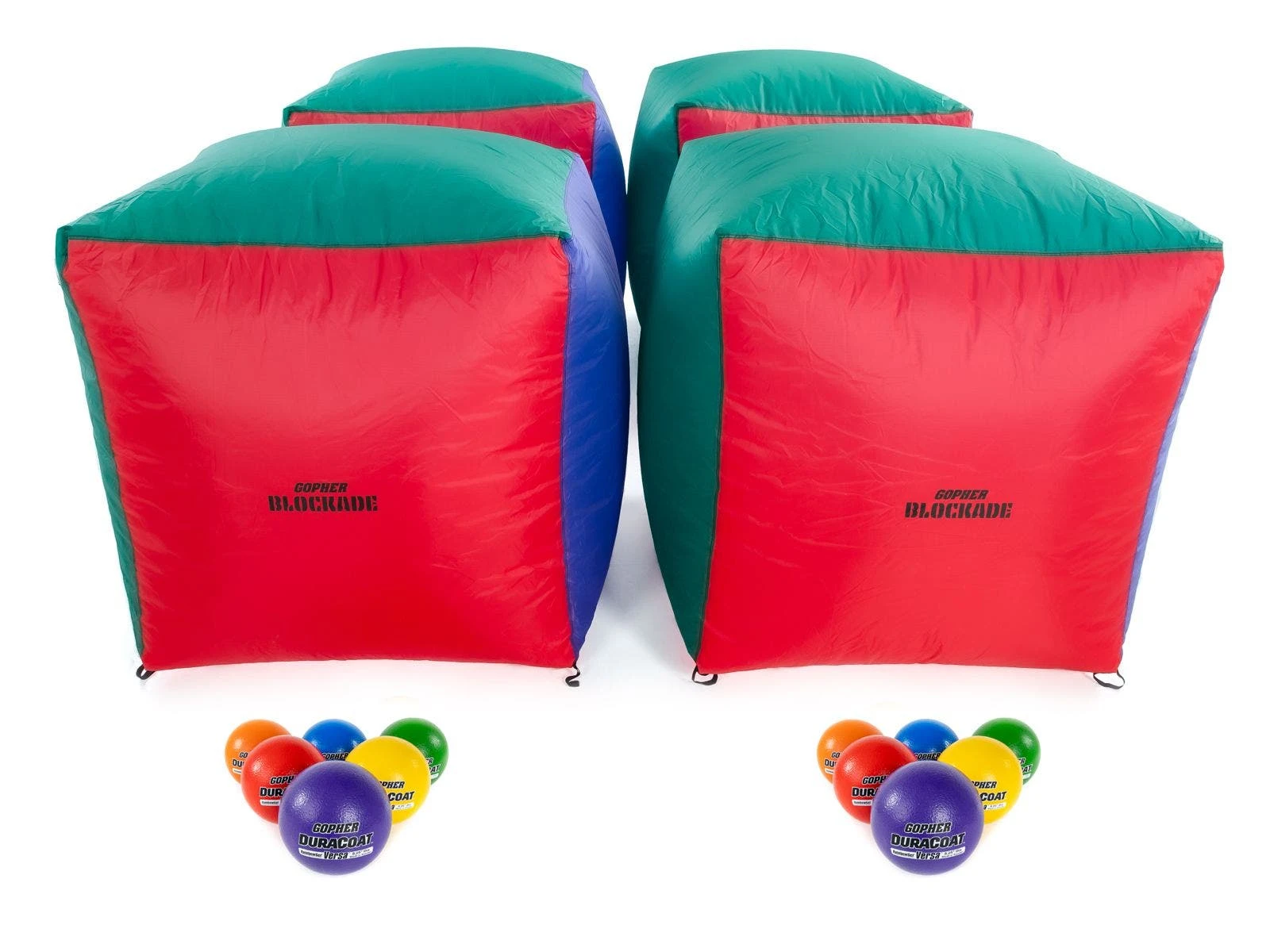 Each barrier is 47-1/4”L x 47-1/4”W x 47-1/4”H with a 5 lb weight sewn into the bottom to keep the cube in place during gameplay. Barriers also include loops in each corner to keep them in place outdoors when using your own stakes. Barriers are designed for use with lightweight balls and not for climbing. Available individually, as a pair, or in Complete Sets with 4 barriers, 12 coated-foam dodgeballs (your choice of DuraCoat or ClassicCoat), and a VersaBag mesh storage bag.