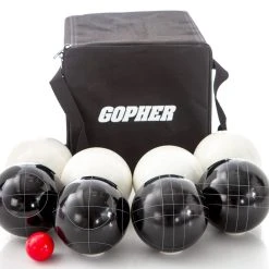 These bocce ball sets include 8 balls and a smaller target ball (pallino). To start, a player tosses the target ball, then other players take turns underhand tossing a ball to get as close as possible to the target. Players score points for each ball that is closer to the target than the closest ball of the opposing team. The first team to 16 points is the winner. The game is excellent for improving hand-eye coordination.