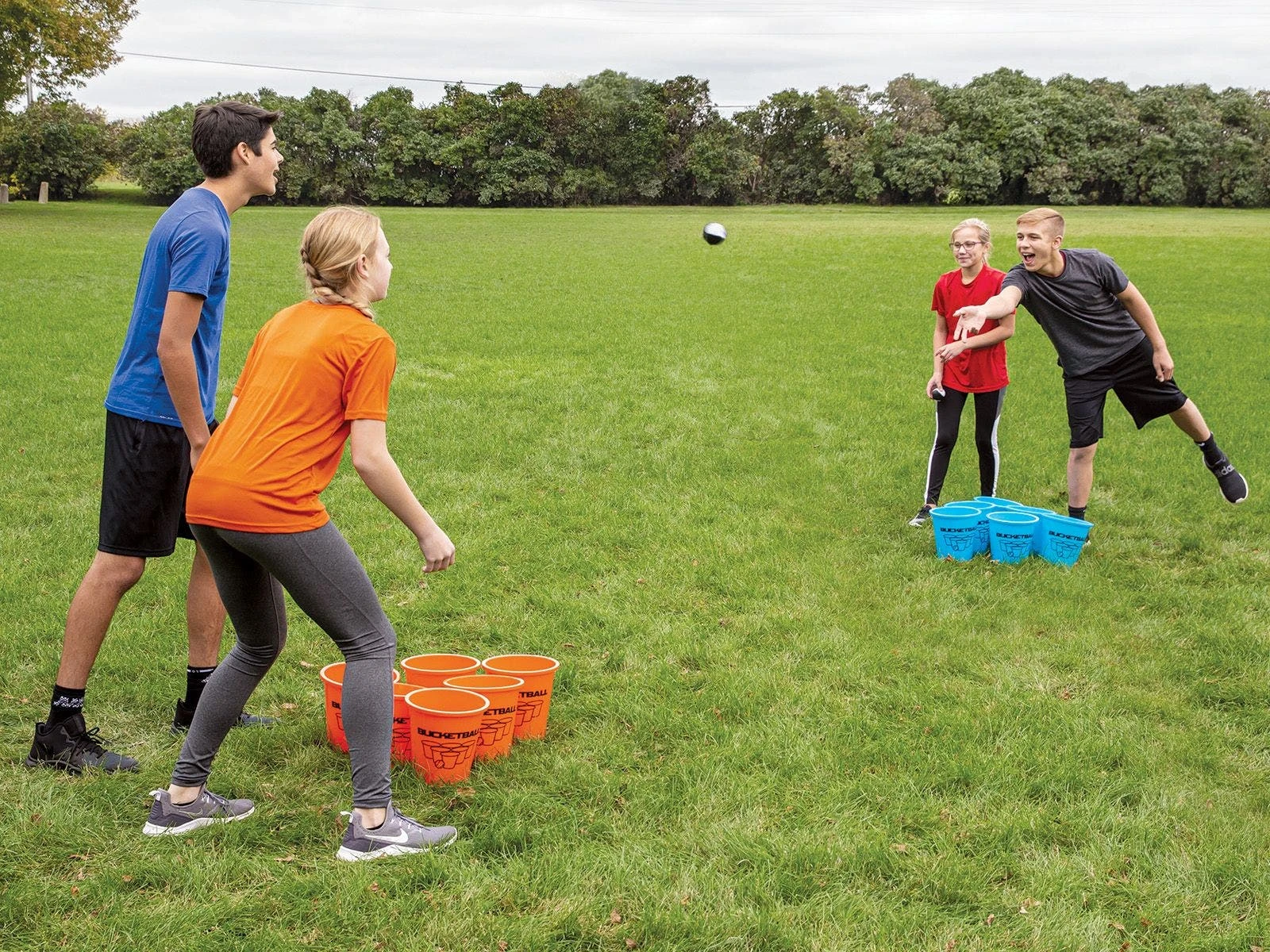 Set up a bucket tossing game that’s customized to the skills and abilities of those playing it. Arrange 6 buckets in a triangle on each end of the play area. Teachers can choose to place the sets as close or far apart as they wish to accommodate players. Each team stands next to one set of buckets and aims for the buckets opposite of them using the included balls. When a ball lands in a bucket, the bucket is removed from play. The first team to remove all of its buckets wins!