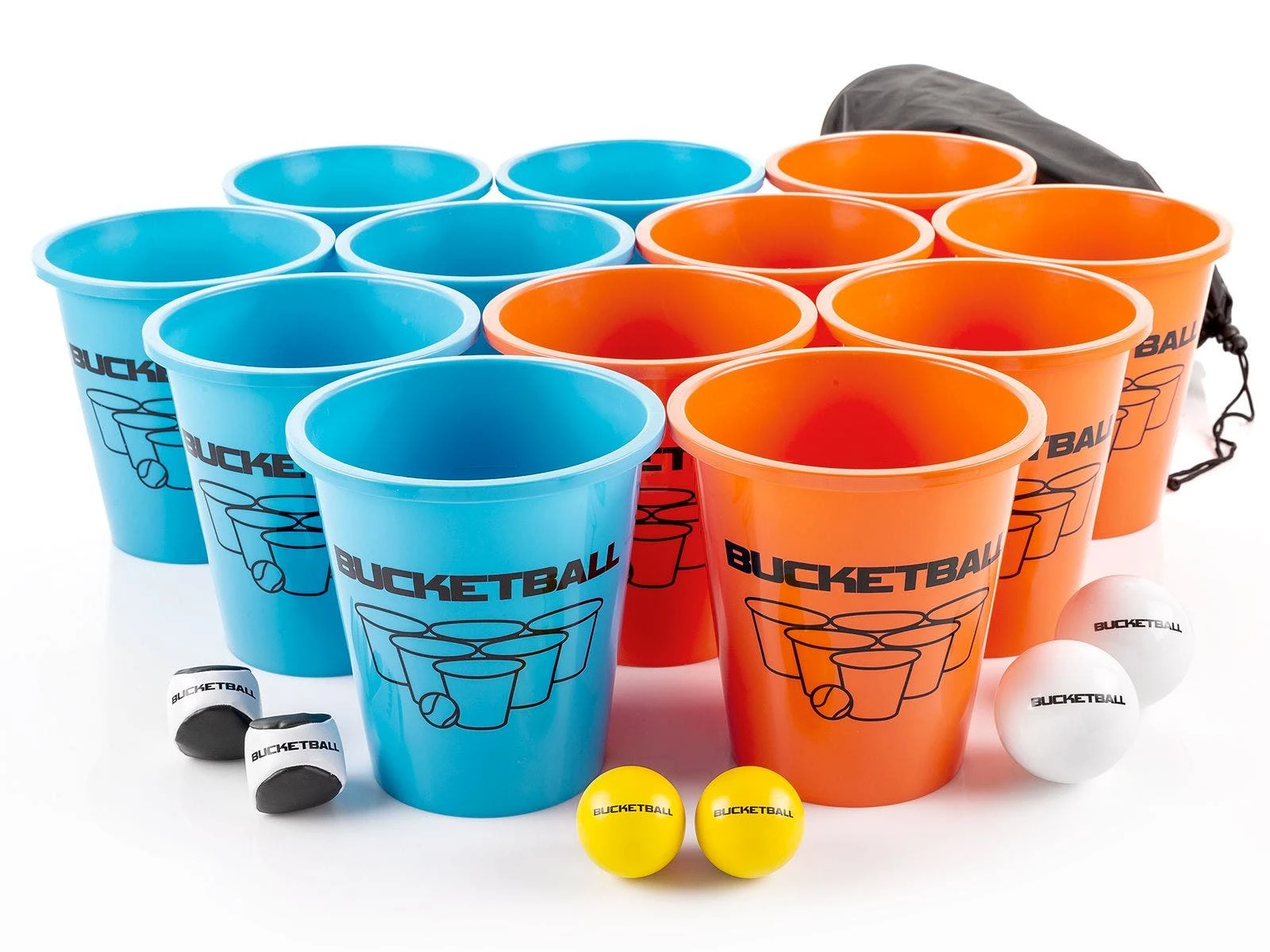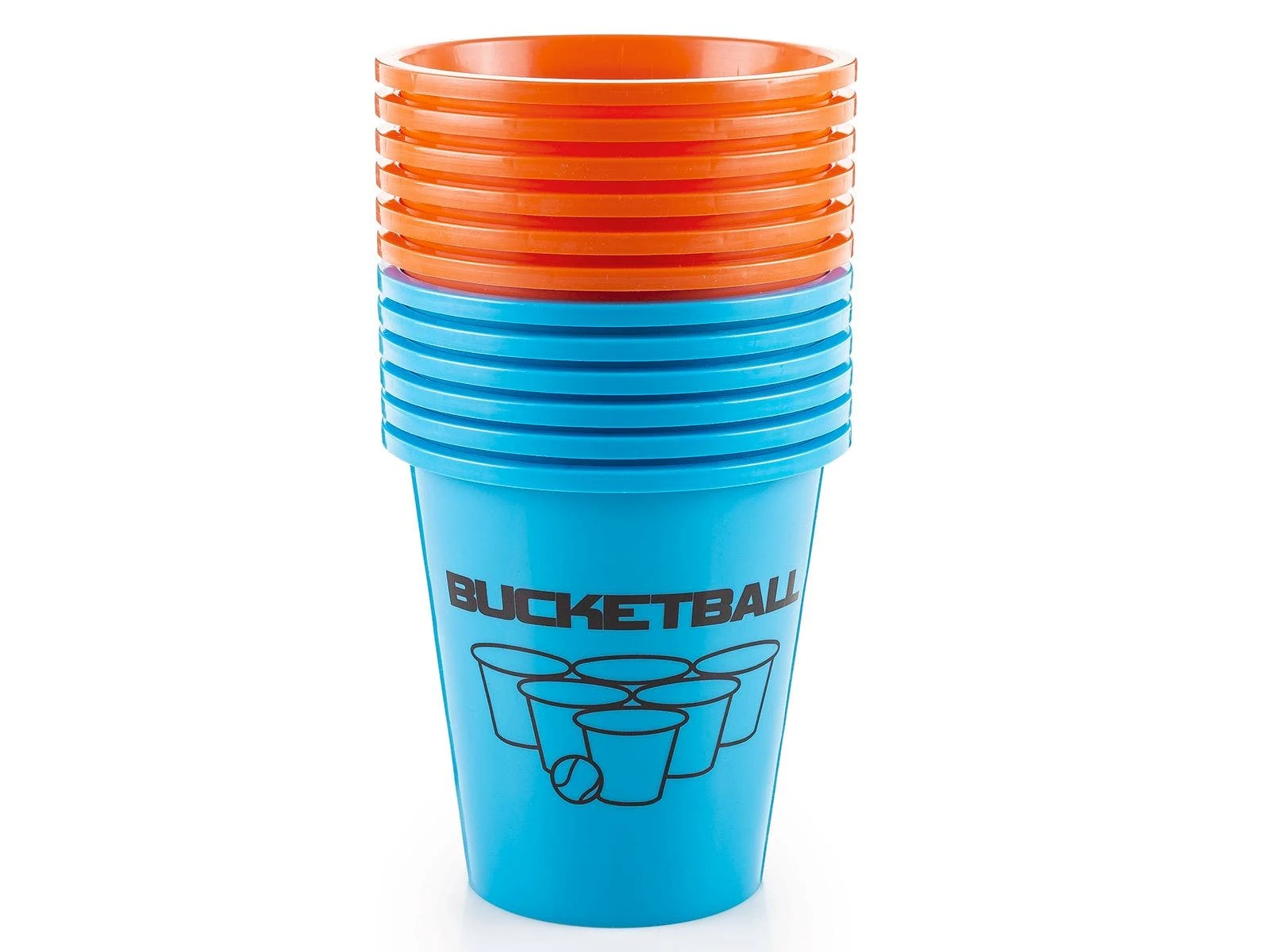 Buckets are made of strong, high-impact plastic and have a reinforced rim for added durability. Fill them with sand or water up to the indicator lines inside the buckets for added stability during game play. Stack them, place the balls inside, and place everything inside the included tote bag for easy transportation and compact storage.