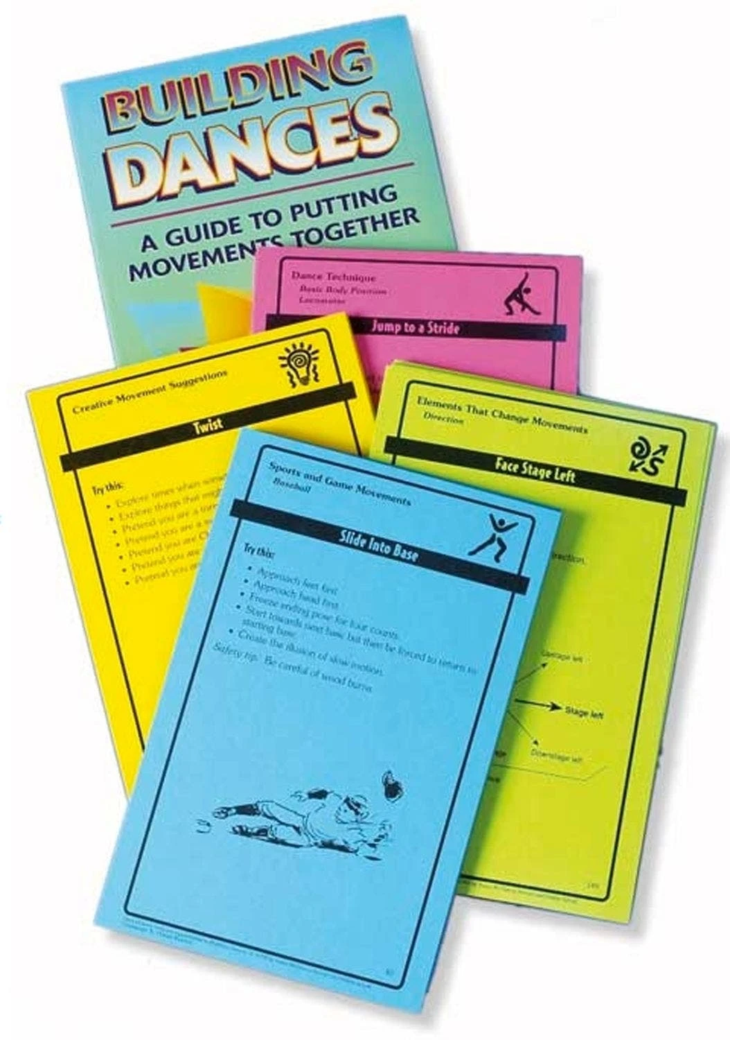 The 112 two-sided cards (6” x 9”) included in this set help students get involved in creating and assessing their work. The cards provide 224 movement ideas to encourage creativity. Each card presents a definition of a selected movement term, a description of the movement, multiple suggestions for students to try, challenges that encourage them to put movements together to form phrases and dances, and a self-evaluation card. Guidebook includes 128 pages with lesson plans.