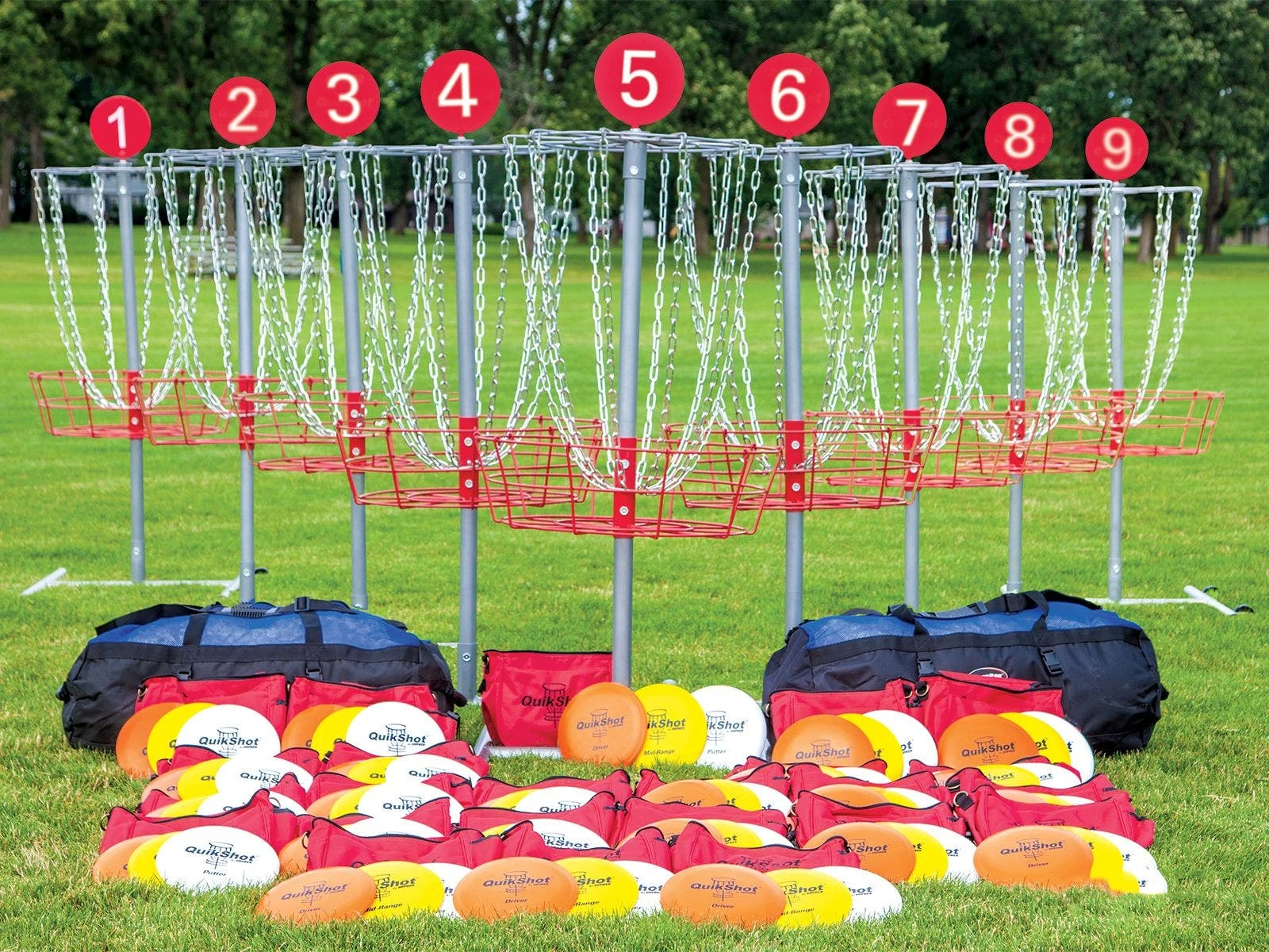 - 9-Hole Pack. Includes 9 QuikShot targets and 24 disc sets with storage bag.