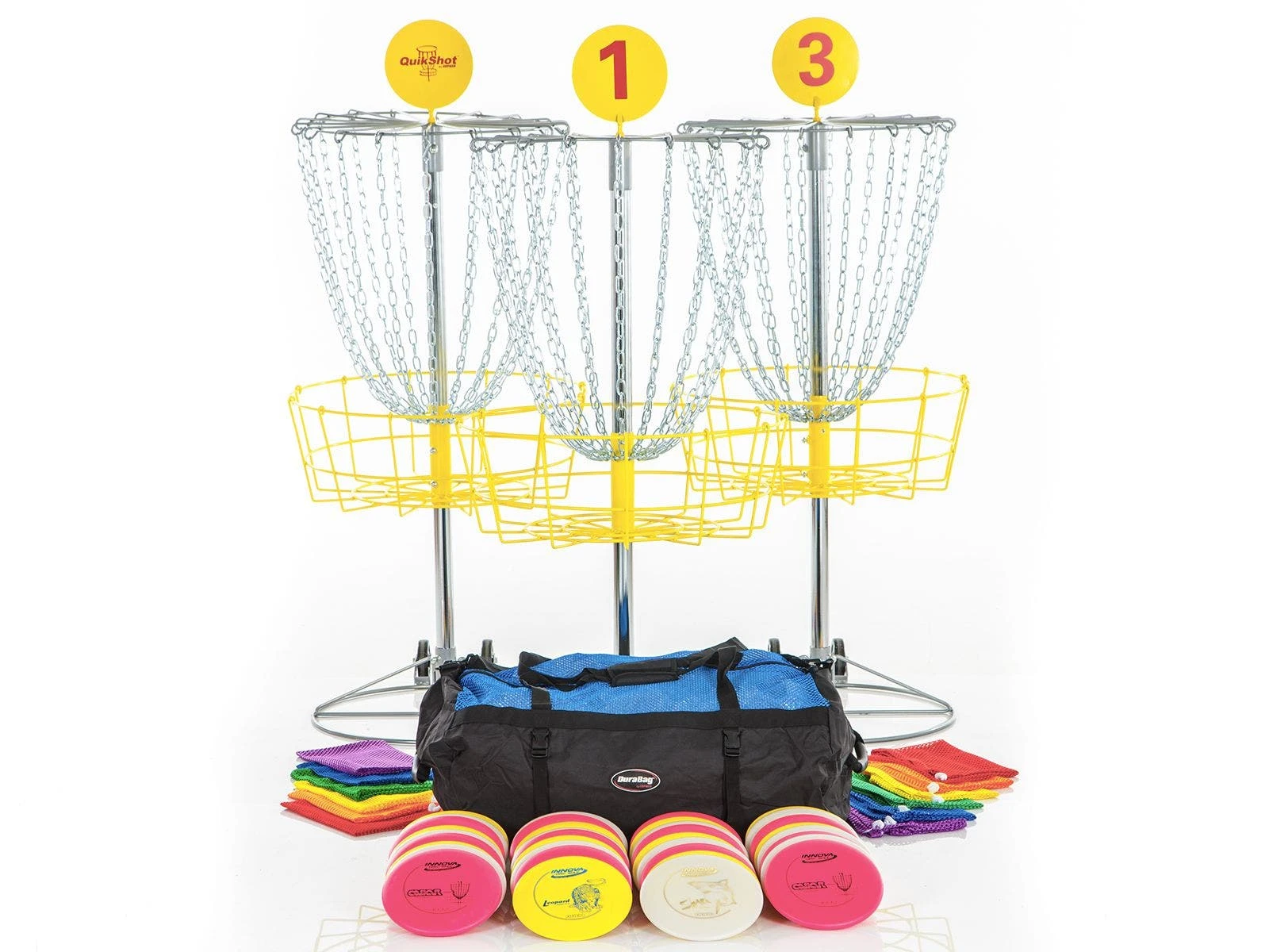 - 3-Hole Pack. Includes 3 QuikShot targets and 12 disc sets with storage bag.