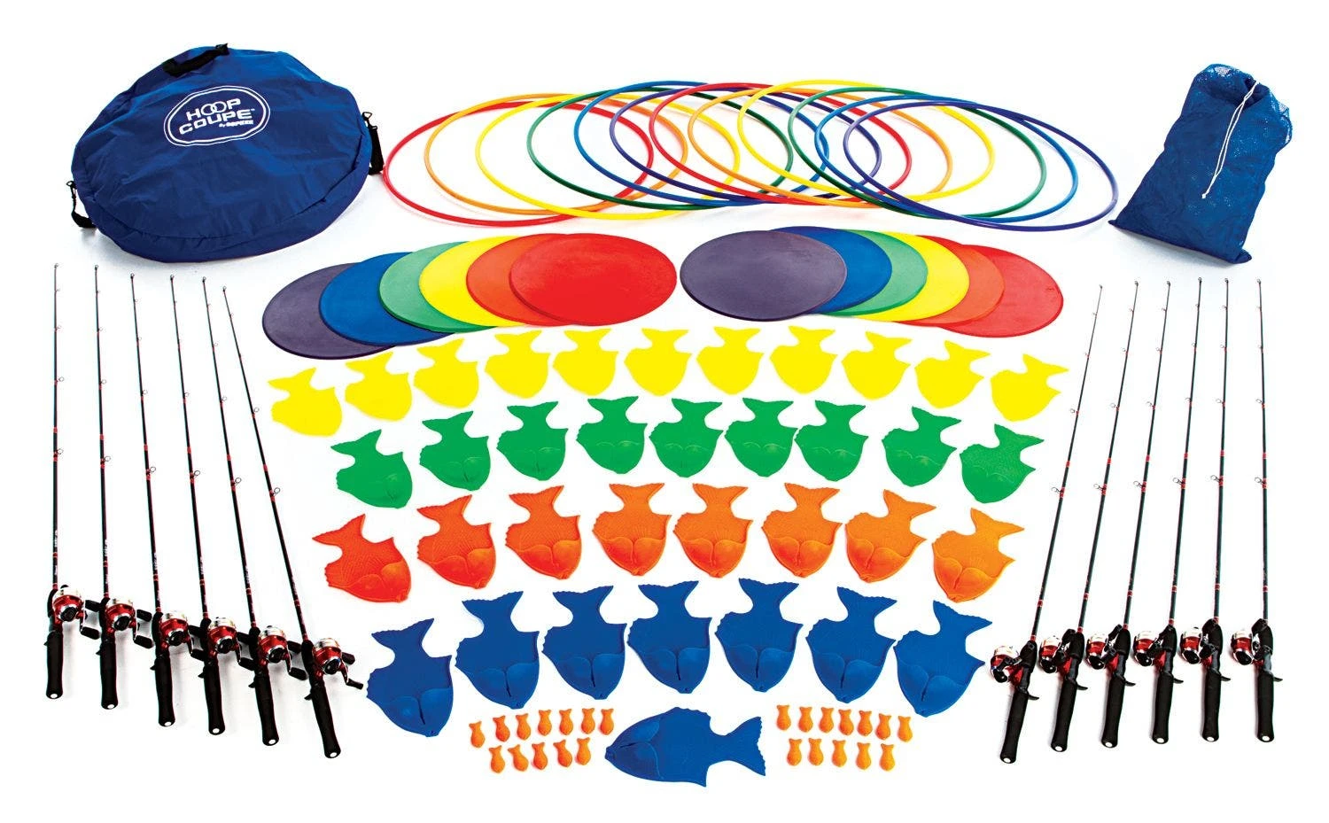 Pack contains everything teachers need to equip their classes for casting lessons of all varieties. This includes poles, plastic fish, vinyl spots, and plastic hoops. Two storage bags are included to hold everything for easy storage and transportation.